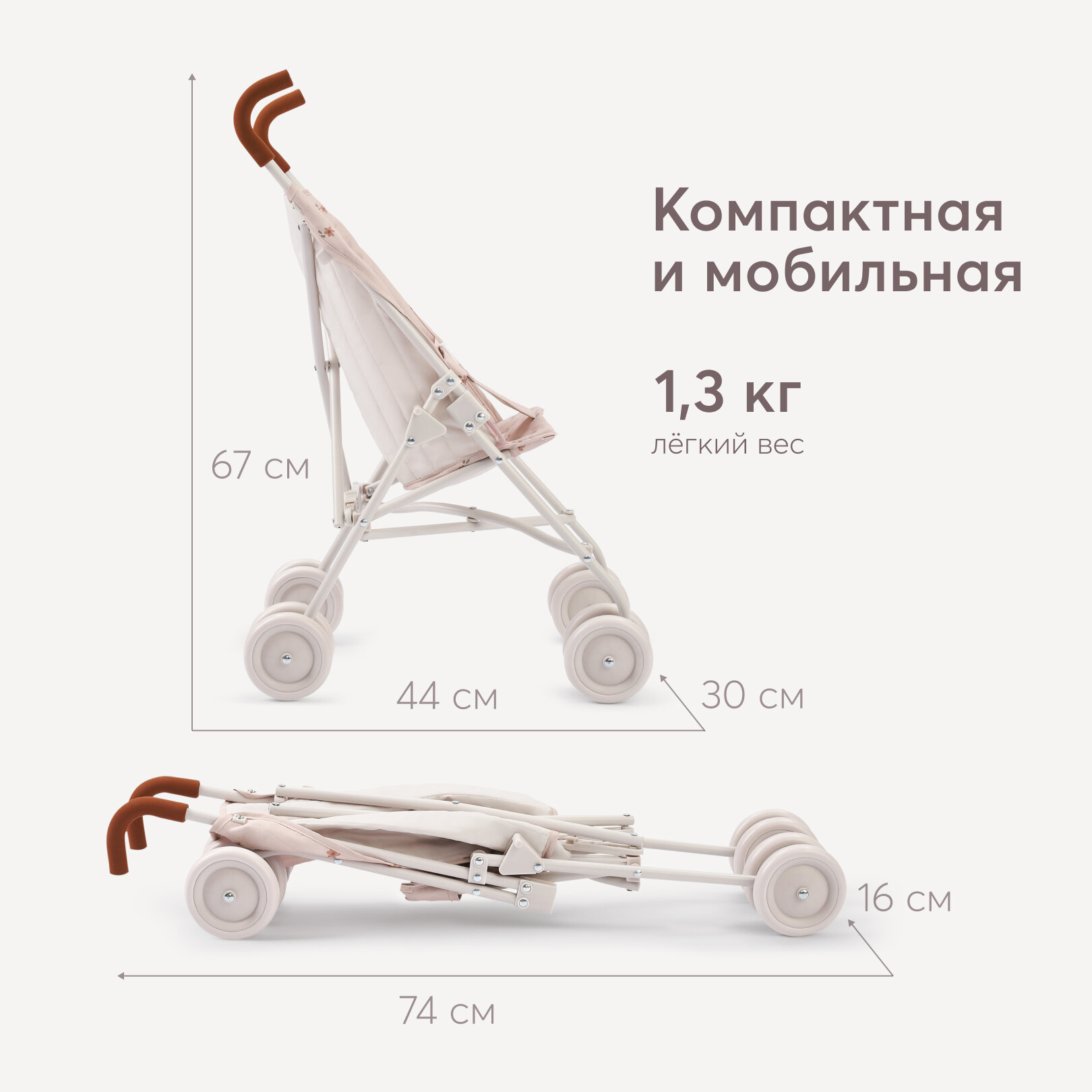 Размеры коляски: 50х33х67 см для детей старше 3 лет. Рекомендации по уходу Элементы из металла и пластика протирать влажной тряпкой, затем протереть насухо. Текстильный материал стирать при температуре не более 40°С на деликатном режиме. Не отбеливать. Деликатный отжим. Гладить при температуре подошвы утюга не более 110.
