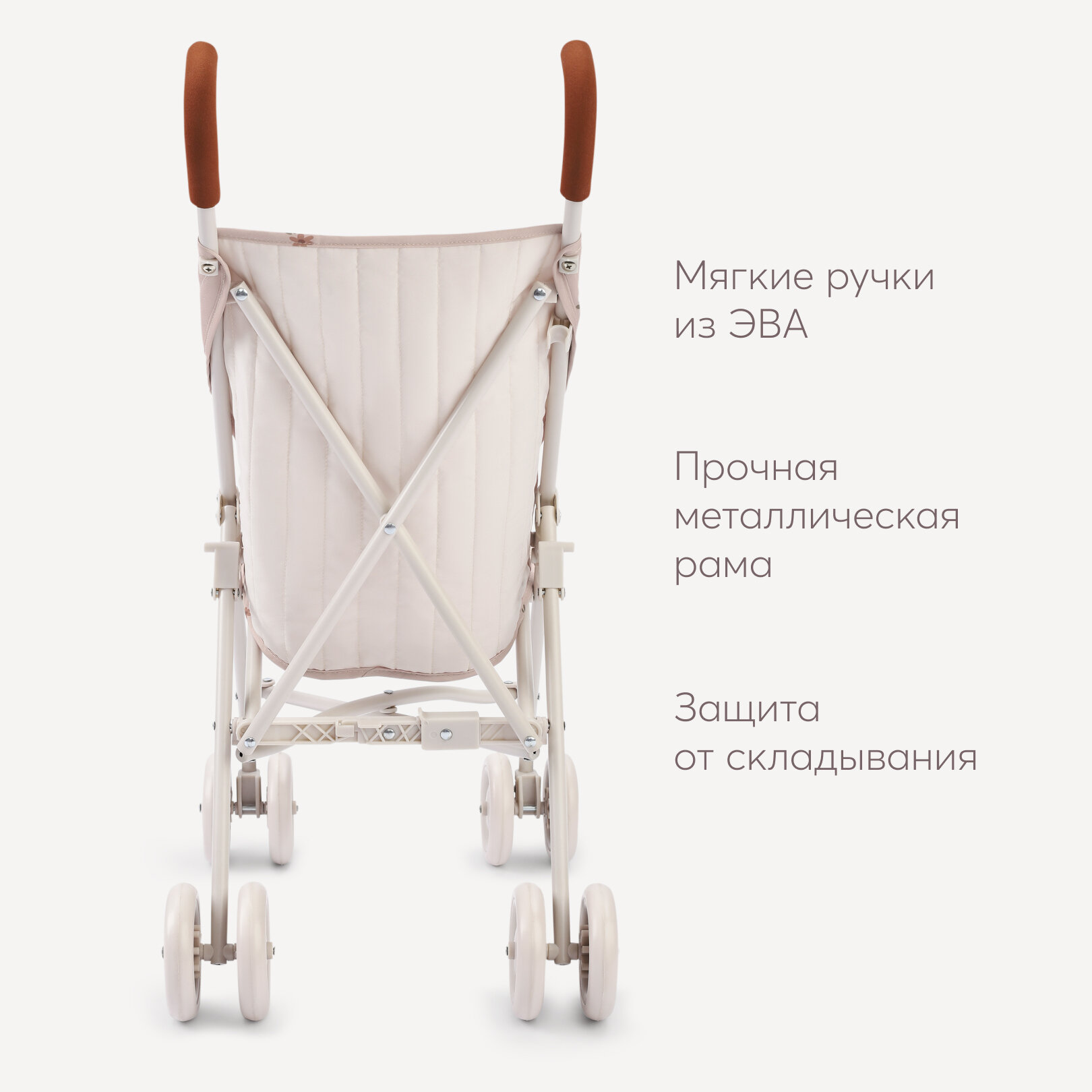Мягкий материал «пенка» у шин колёс, думаю, на улице быстро потеряют опрятность. Расстроило, что рисунок на ткани только с одной стороны, с другой просто изнанка.