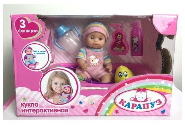 Ниже Вы можете прочитать отзывы на Пупс "Карапуз" 15 СМ, 3 функции: пьет и писает, в ванночке, с аксессуарами, ознакомится с подробными характеристиками, посмотреть интересные обзоры и фотографии на Пупс "Карапуз" 15 СМ, 3 функции: пьет и писает, в ванночке, с аксессуарами.