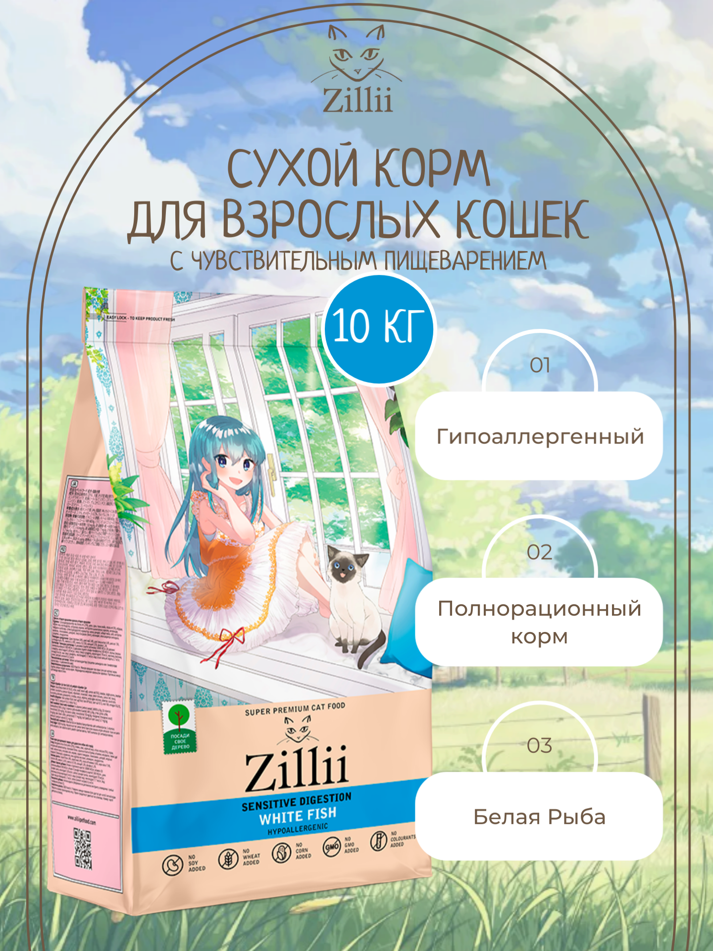 ZILLII Sensitive Digestion Cat Сухой корм для кошек с чувствительным пищеварением, Белая Рыба 10кг
