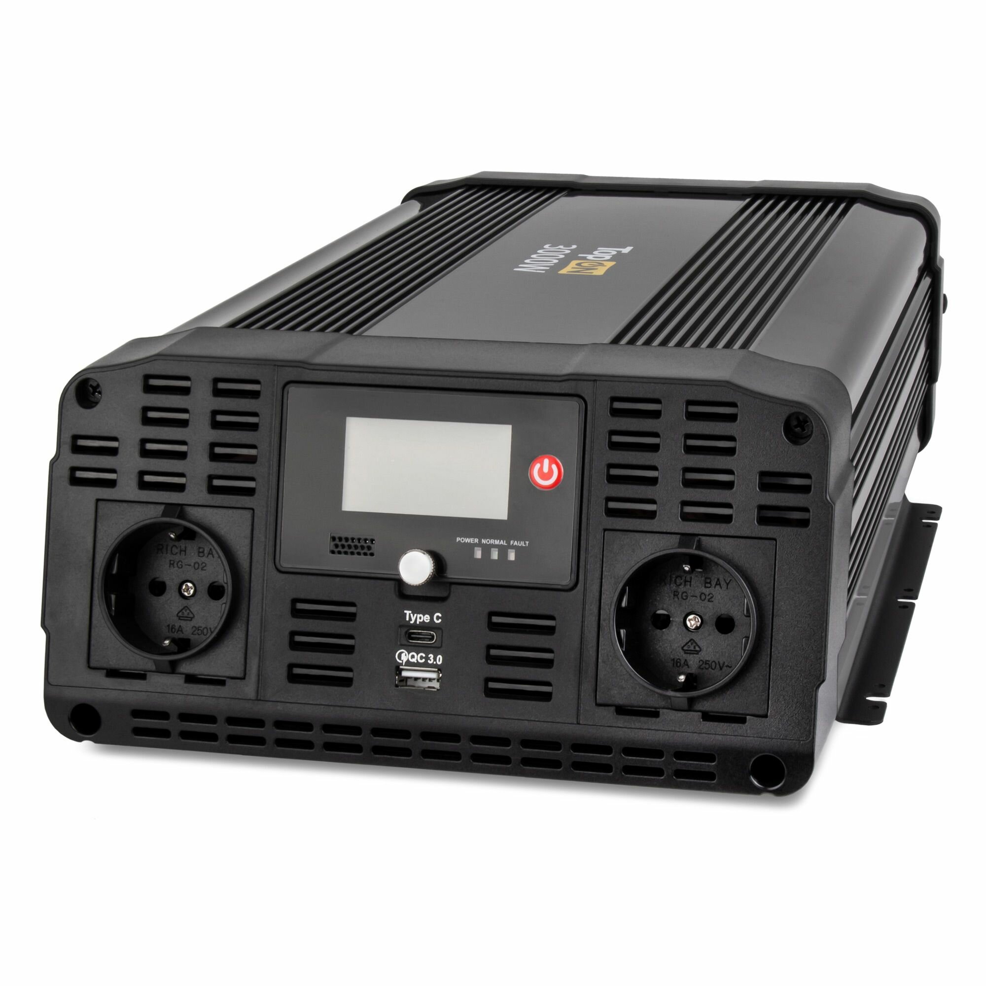 TopOn Автомобильный инвертор 3000w 2 розетки, чистый синус, type-c pd, usb qc, lcd экран, пиковая мощность 6000w черный TOP-PI3000