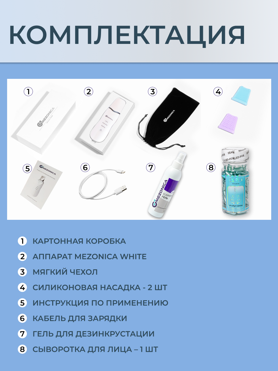 Mezonica Набор 3 в 1 Чистка лица и Омоложение (скрабер, белый + УЗ гель холодного гидрирования + Серум капсулы витамин Е )