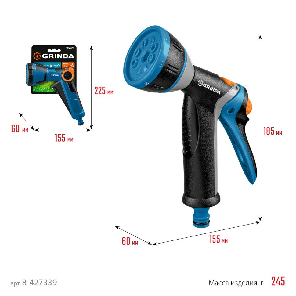 | Комплектация | GRINDA PROLine BM-8, 8 режимов, курок сзади, пистолет поливочный металлический с TPR - 1 штука |