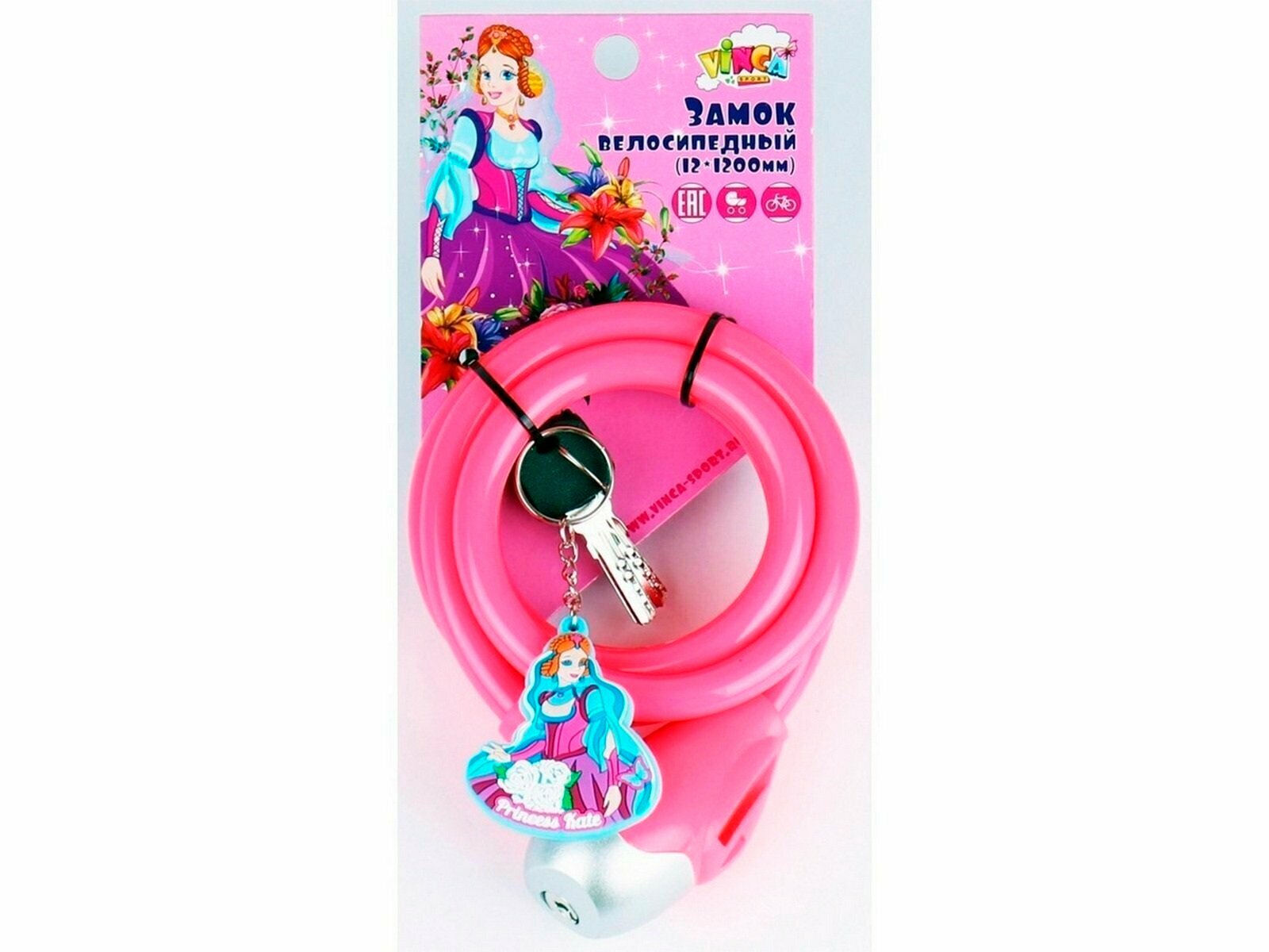 VS 561 Princes Kate. Замок велосипедный c брелоком 12*1200мм, с защитой от влаги и креплением, розовый.