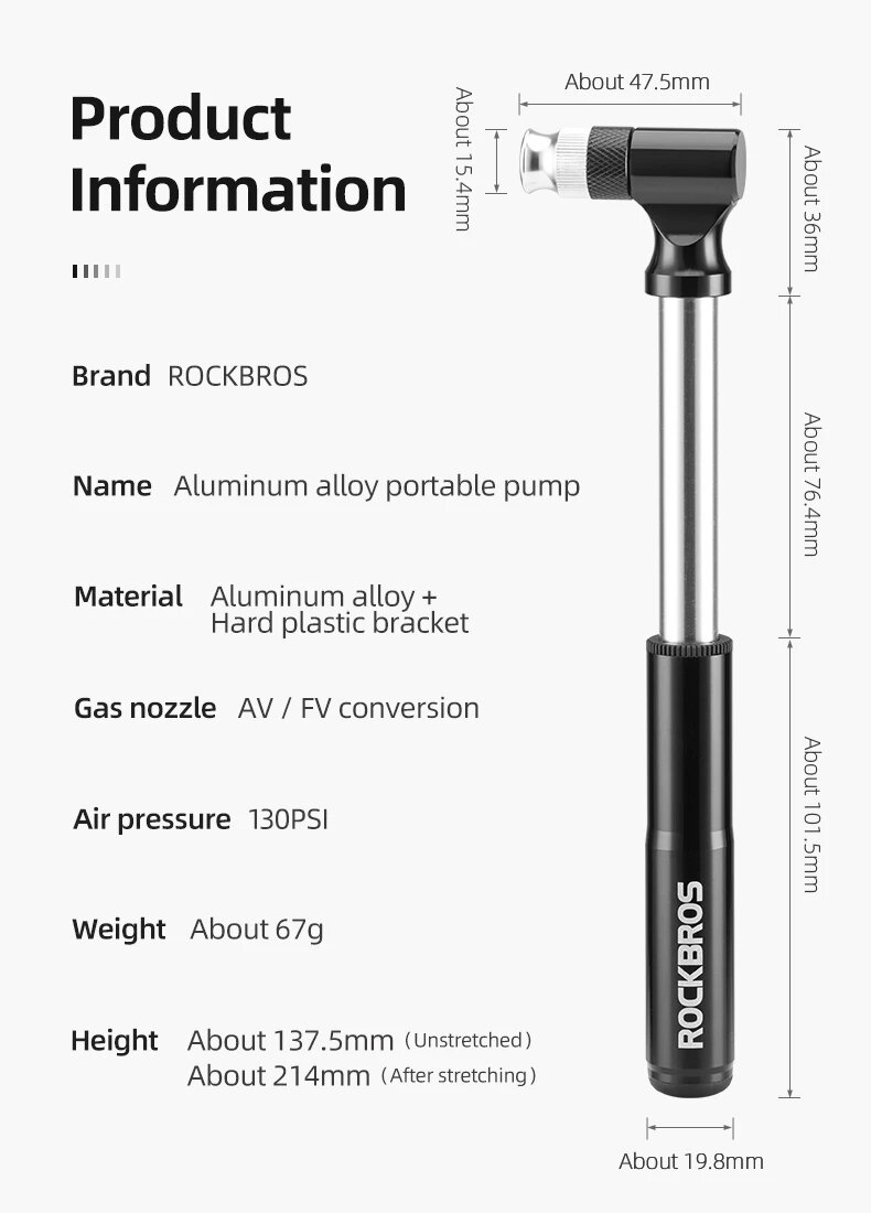Насос велосипедный ручной ROCKBROS, портативный, давление 130 psi, Presta, Schrader JG-PB-11