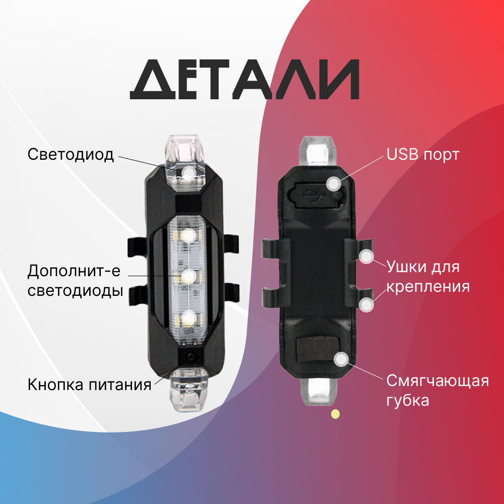 Задний фонарь для велосипеда аккумуляторный, велофонарь (4 режима, USB, красно-синий) интересное: