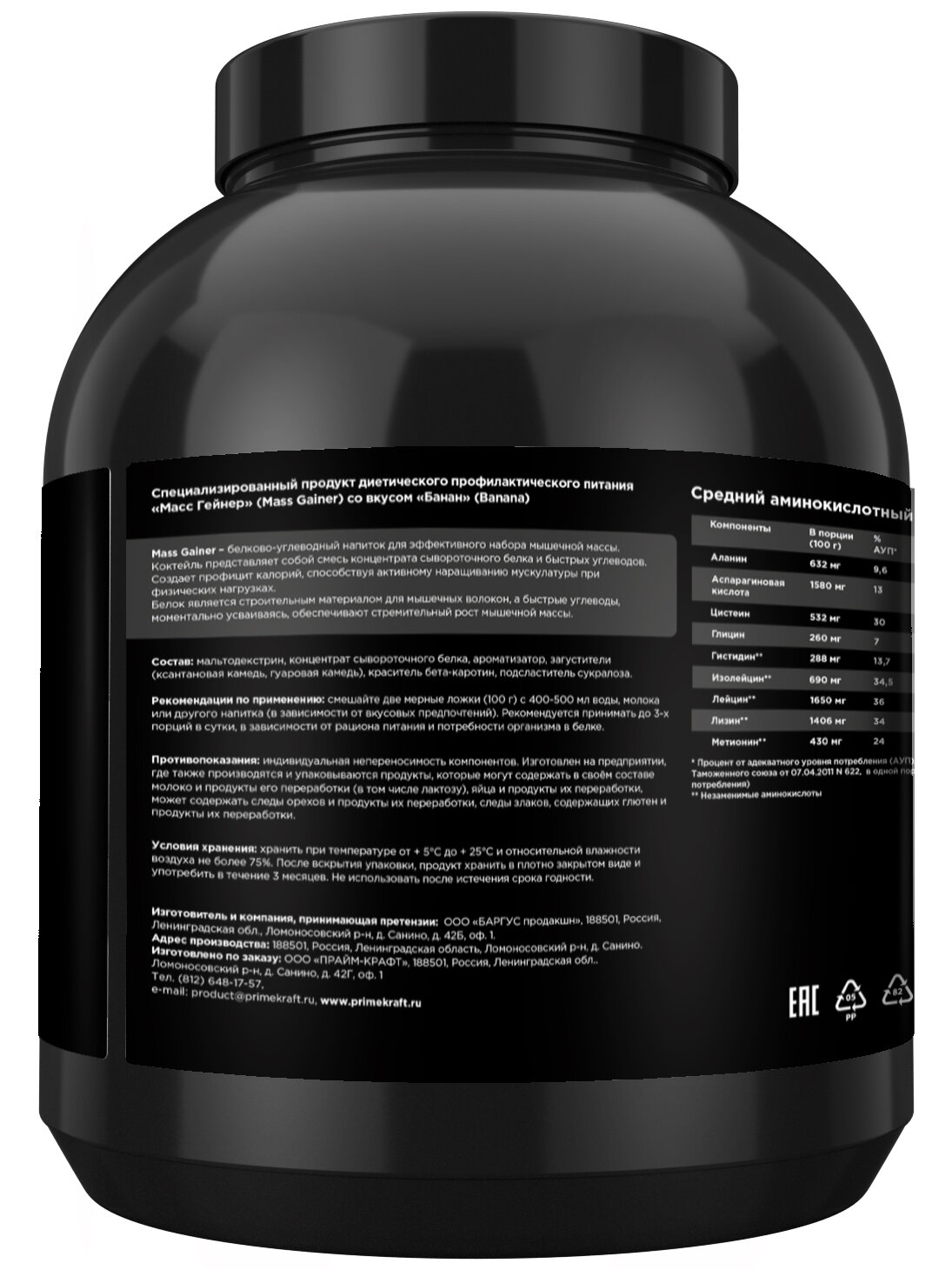 Гейнер белково-углеводный PRIMEKRAFT/ MASS GAINER для набора массы со вкусом «Банан», 3 кг, банка