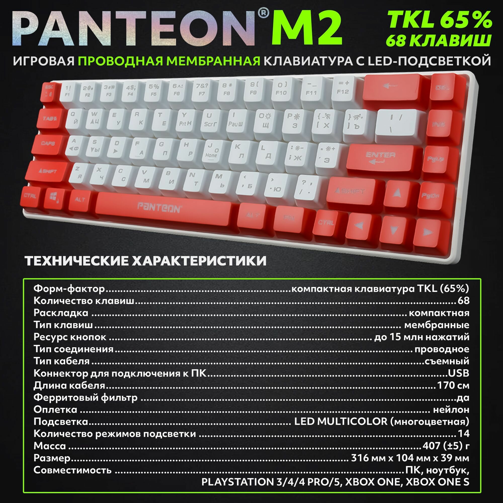 PANTEON M2 Red-White(06) Игровая мембранная TKL (65%) клавиатура с LED-подсветкой MULTICOLOR (68 кл, USB), цвет: красный-белый (06)