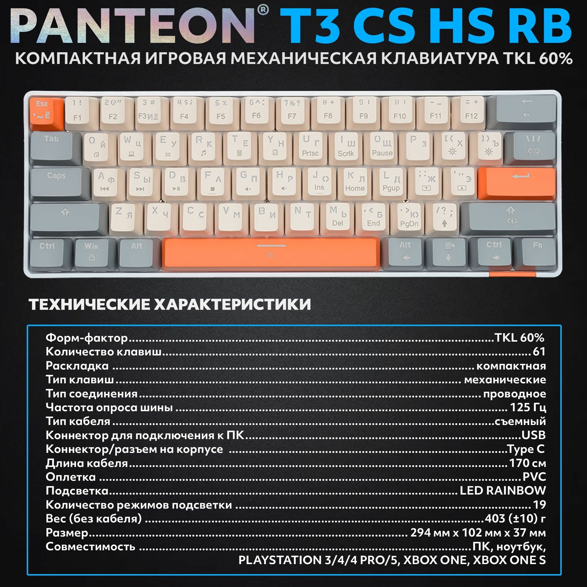 PANTEON T3 RS HS RB White-Grey (37) Механическая клавиатура (TKL 60%, подсветка LED RAINBOW, Jixian Red, 61 кл, HotSwap, USB), цвет: белый-серый (37)