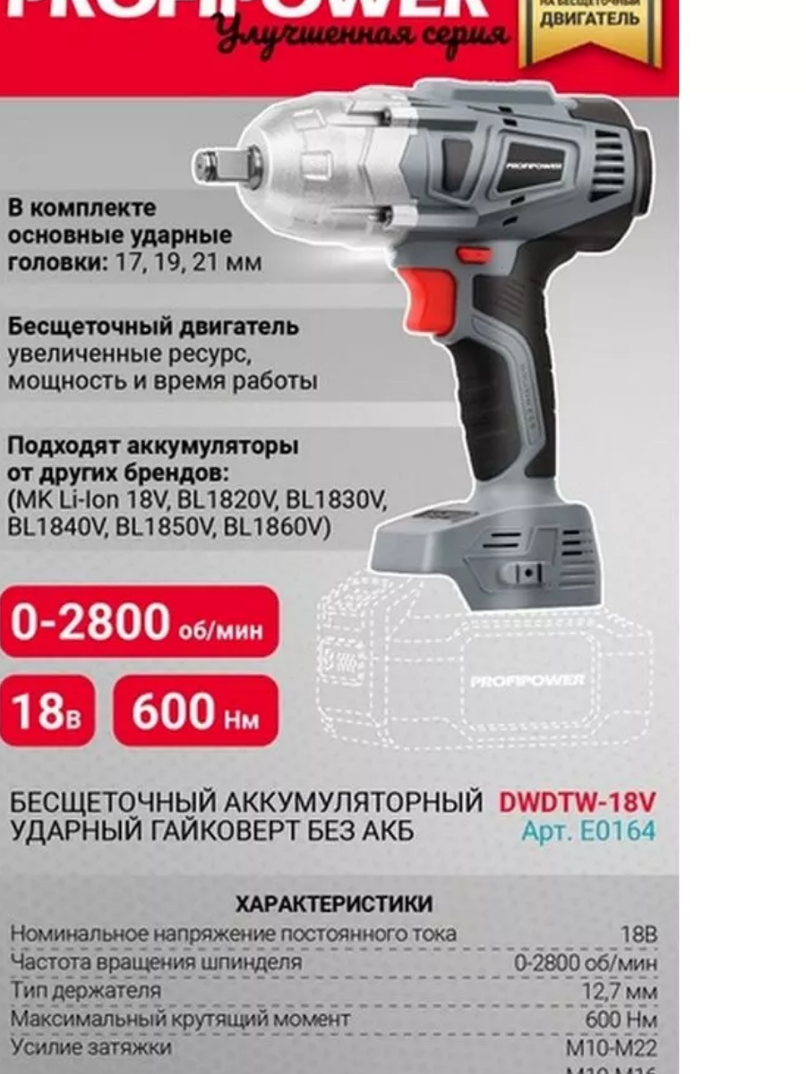 Аккумуляторный гайковерт бесщеточный ударный ProfiPower DWDTW-18V, без АКБ и ЗУ, 600Нм, набор головок 17/19/21мм интересное: