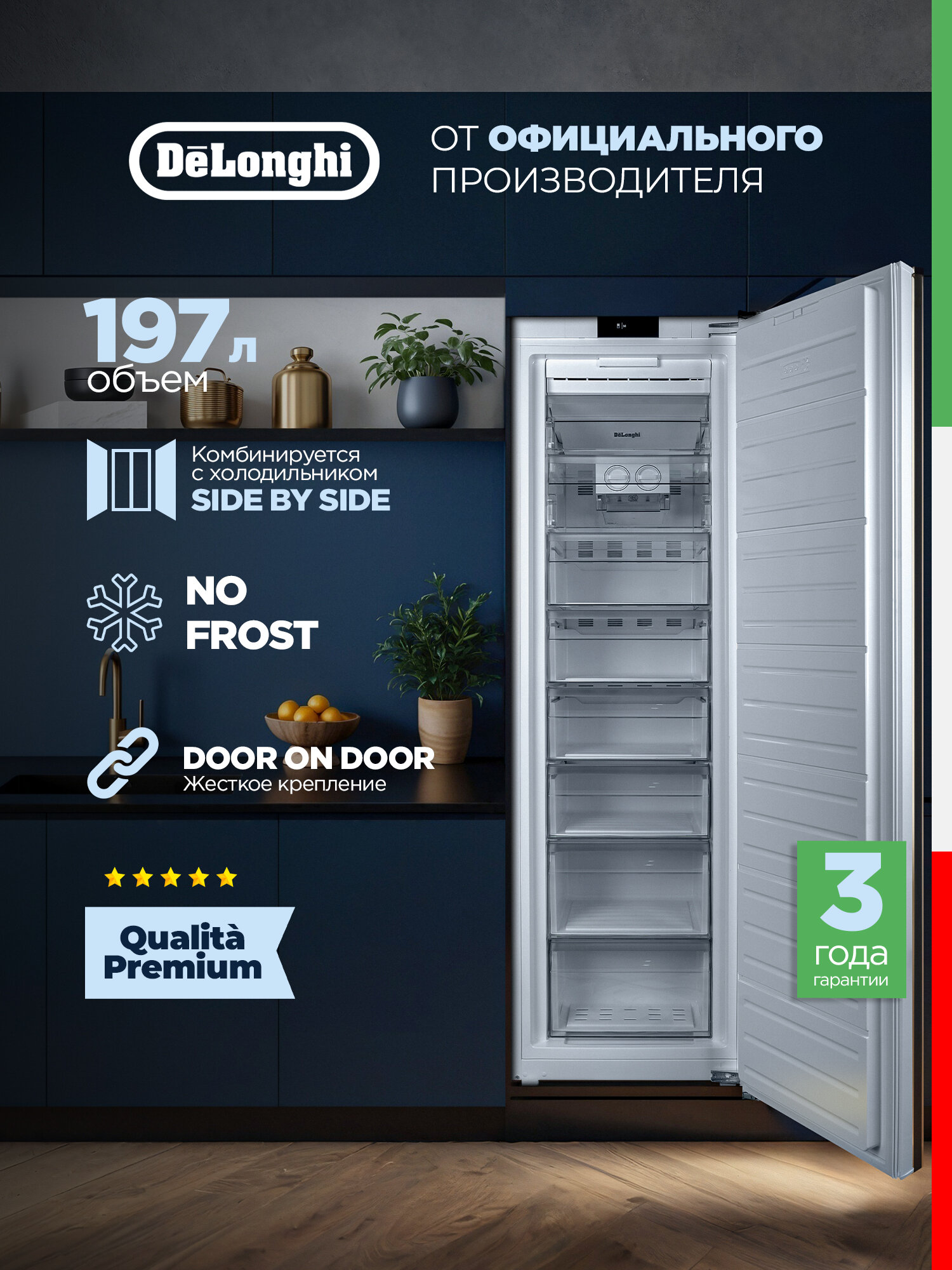 Купить Встраиваемая морозильная камера DeLonghi DFI 17NFE PAOLO, белая, объем 221 л, 7 выдвижных ящиков, Сенсорное управление, Door on Door,