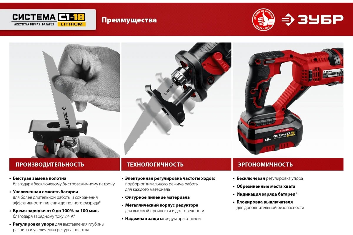 Сабельная аккумуляторная пила ЗУБР ЗПС-18-40, 2600 ходов в минуту, 18V, 4Ач интересное: