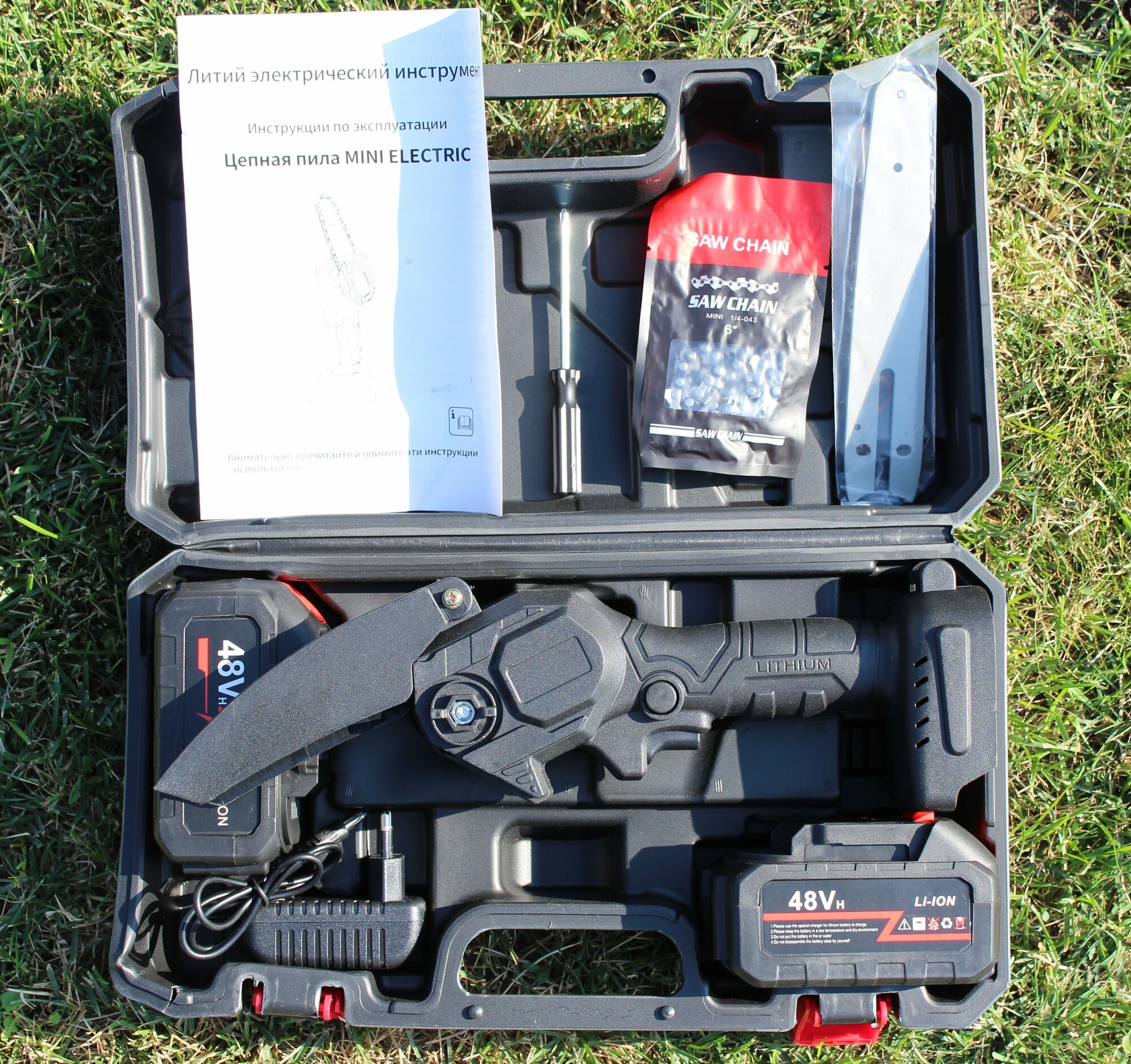 | Комплект поставки | Мини-пила 1 шт, Шина 6", цепь 6", Зарядное устройство 1 шт, Литиевая батарея 2 шт, Кейс 1 шт. |