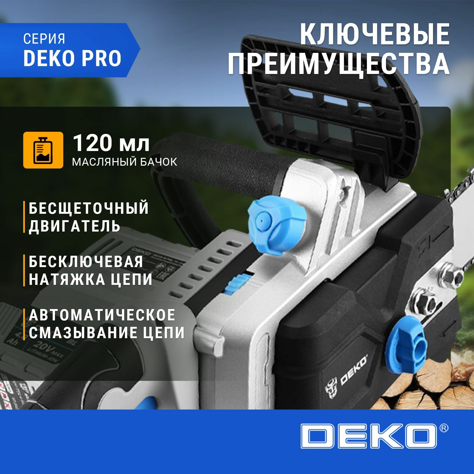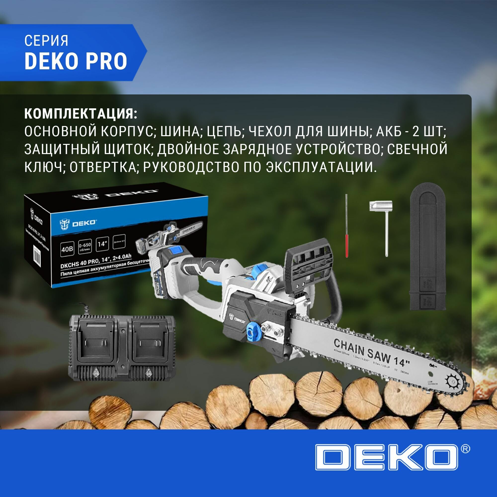 СохранитьПила цепная аккумуляторная бесщеточная DEKO DKCHS 40 PRO, 14", 2х20В, 2x4.0Ач, двойное з/у интересное: