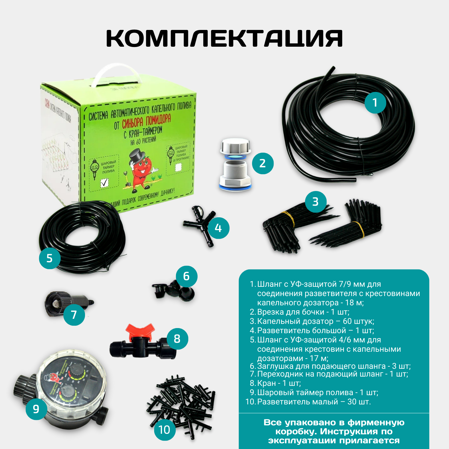 | Комплектация | Таймер шаровый автоматический - 1 шт, шланг магистральный 7/9 мм - 18 м, шланг подающий 4/6 мм - 17 м, капельницы - 60 шт, кран - 1 шт, заглушка для подающего шланга - 3 шт, малый разветвитель - 30 шт, врезка для бочки - 1 шт, разветвитель с пробкой - 1 шт, инструкция по эксплуатации - 1 шт, упаковочный короб - 1 шт. |
