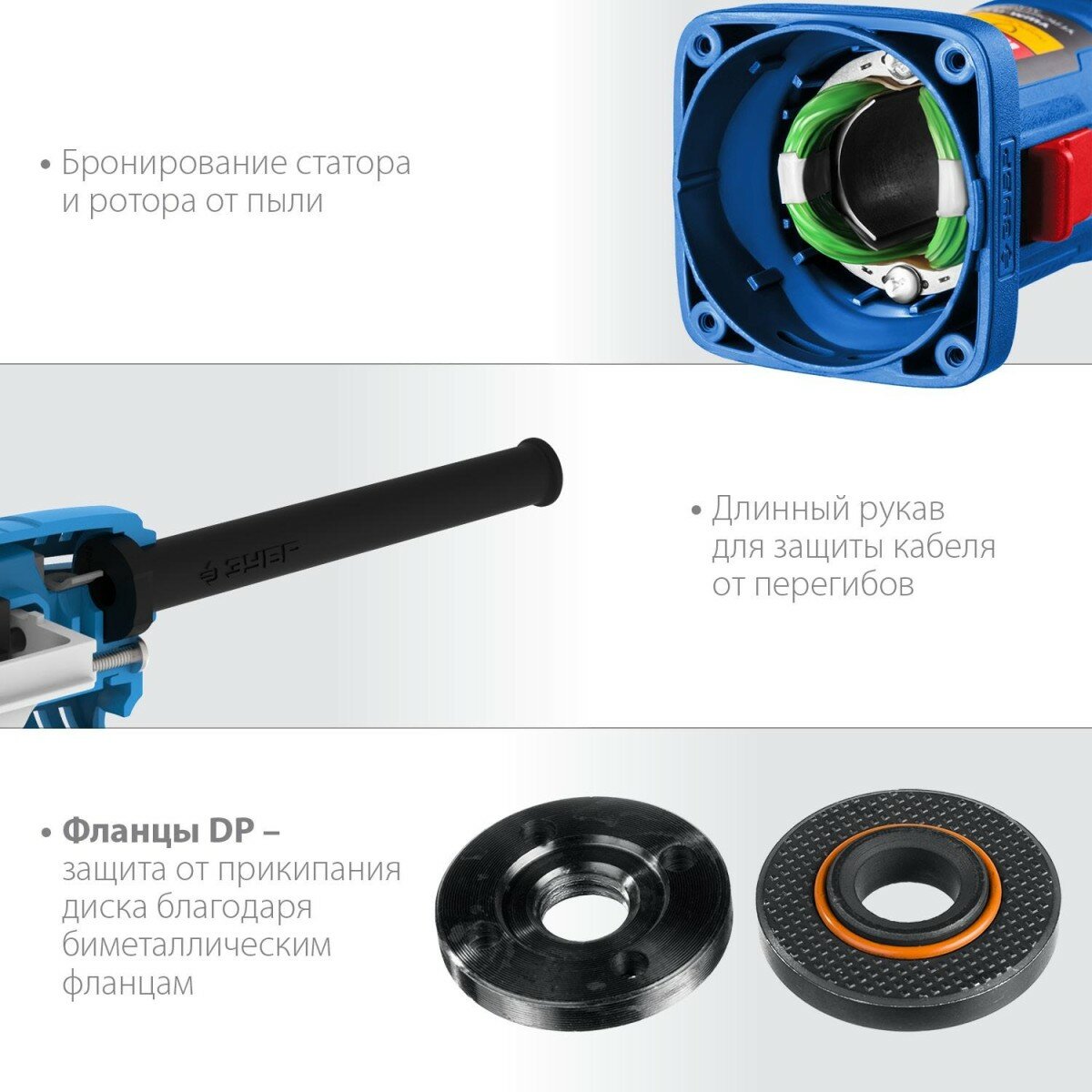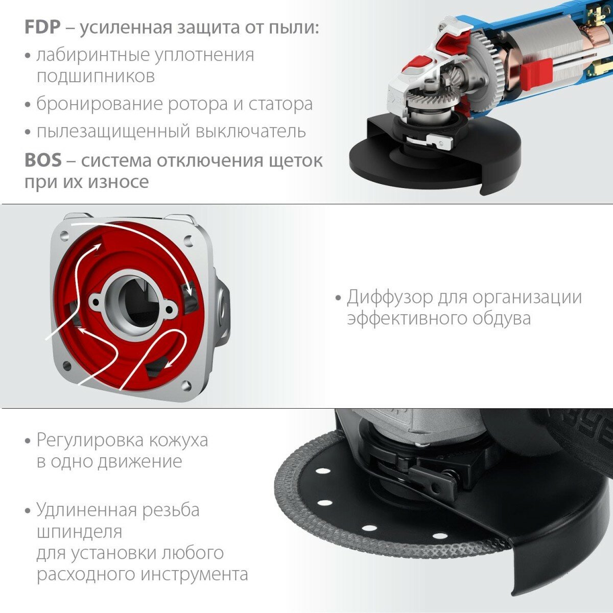 | Особенности конструкции | блокировка кнопки включения / дополнительная рукоятка / регулировка положения кожуха без инструмента / фиксация шпинделя / Замена щеток без разбора / Защитный кожух / Рукоятки с резиновым покрытием / суперфланец / блокировка кнопки включения / дополнительная рукоятка / фиксация шпинделя |