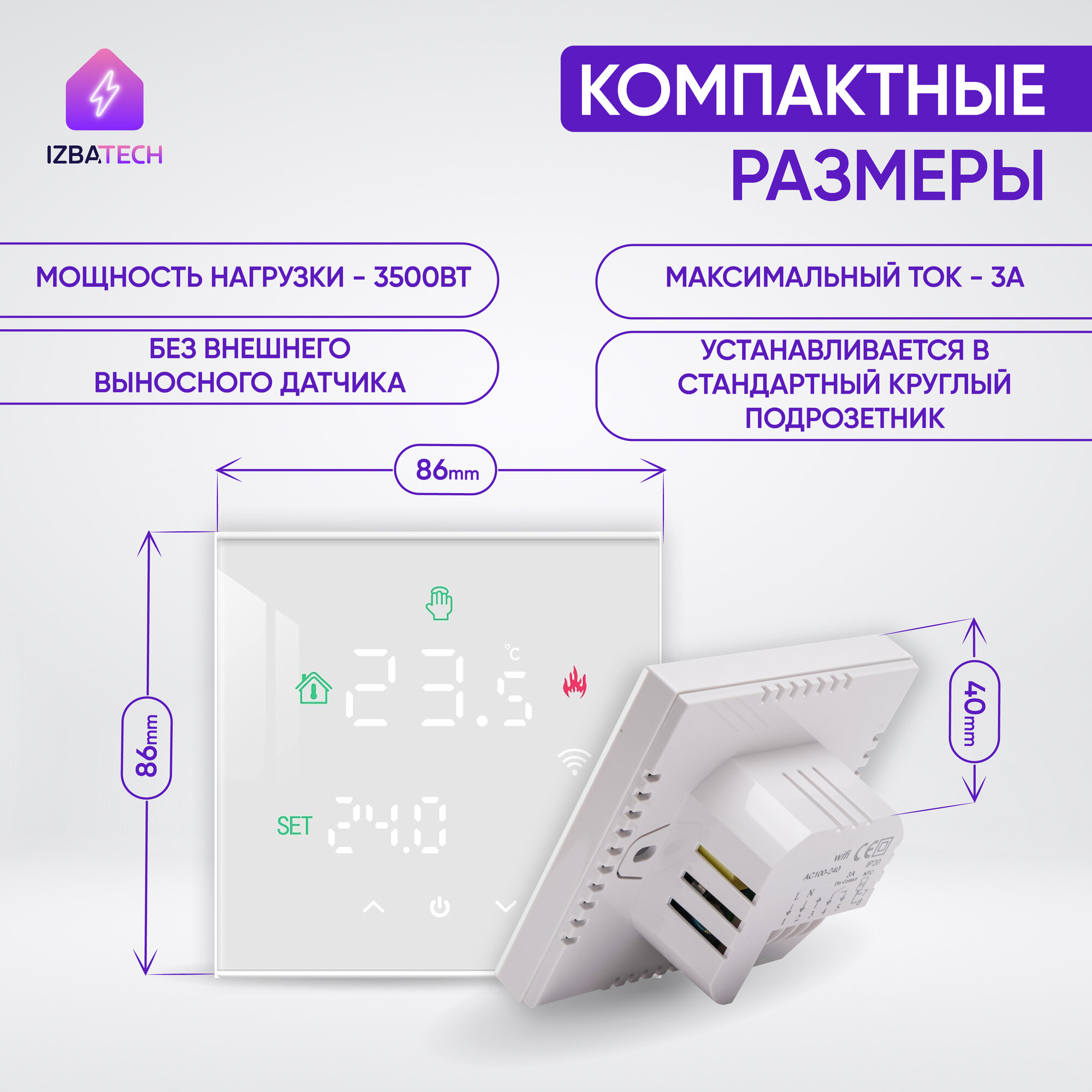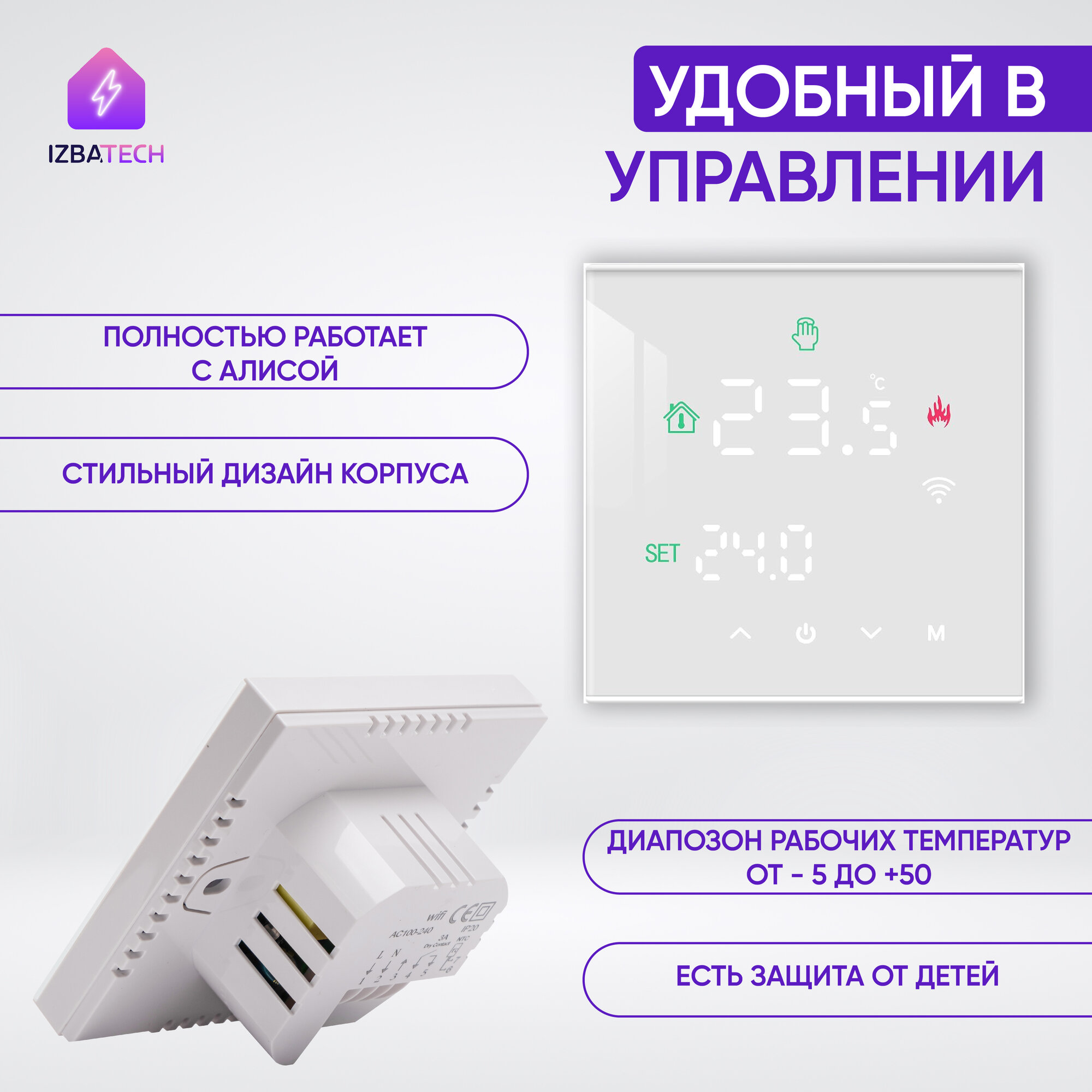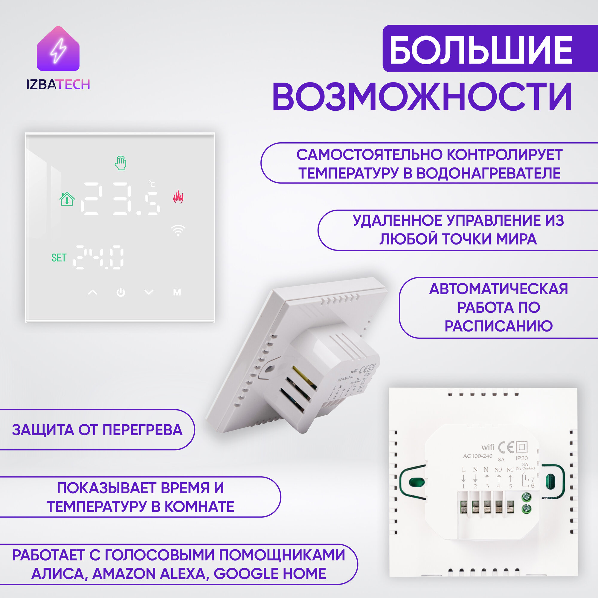 Умный терморегулятор для бойлера, белый для Яндекс Алисы на 3А с WIFI, сенсорный, с ЖК экраном