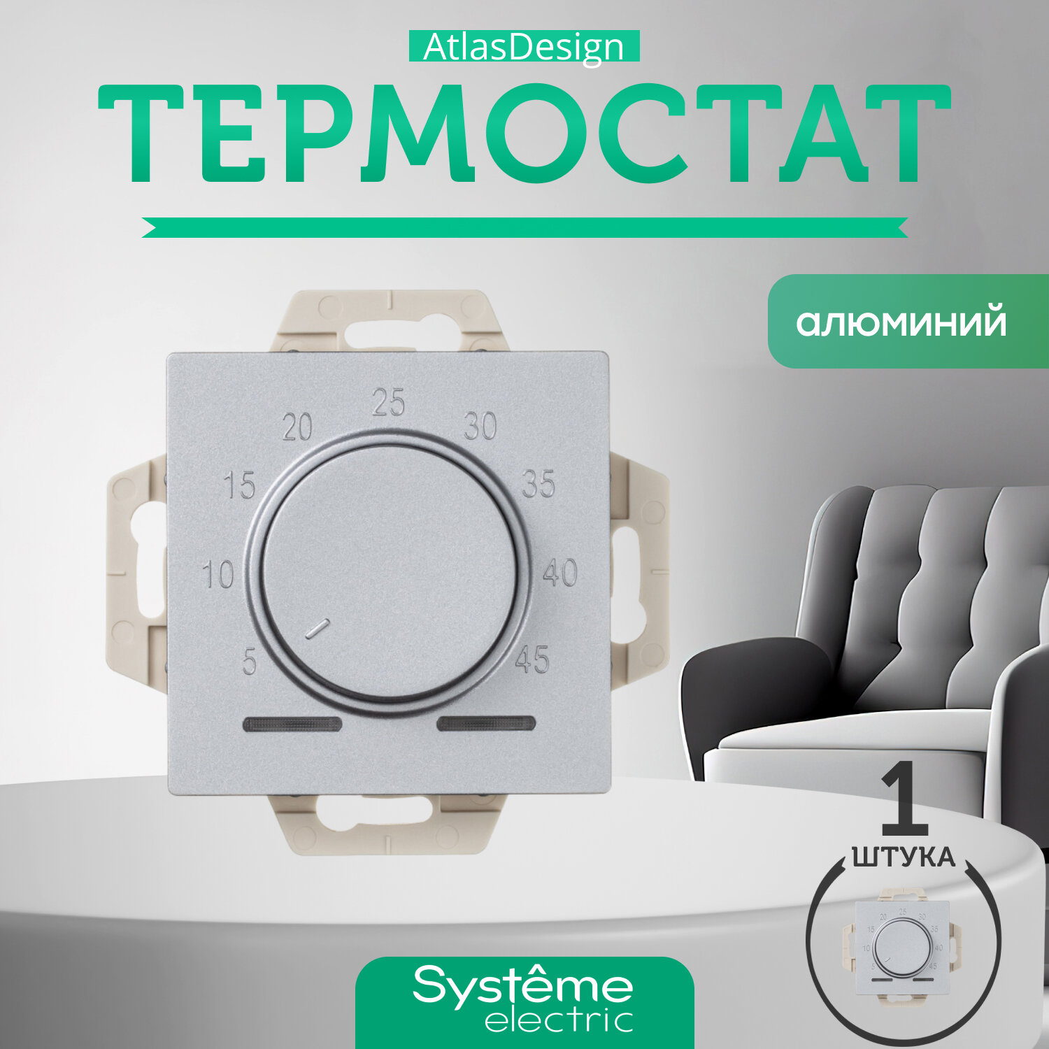 Systeme Electric AtlasDesign алюминий термостат электрон. теплого пола с датчиком, 10A, механизм ATN000335