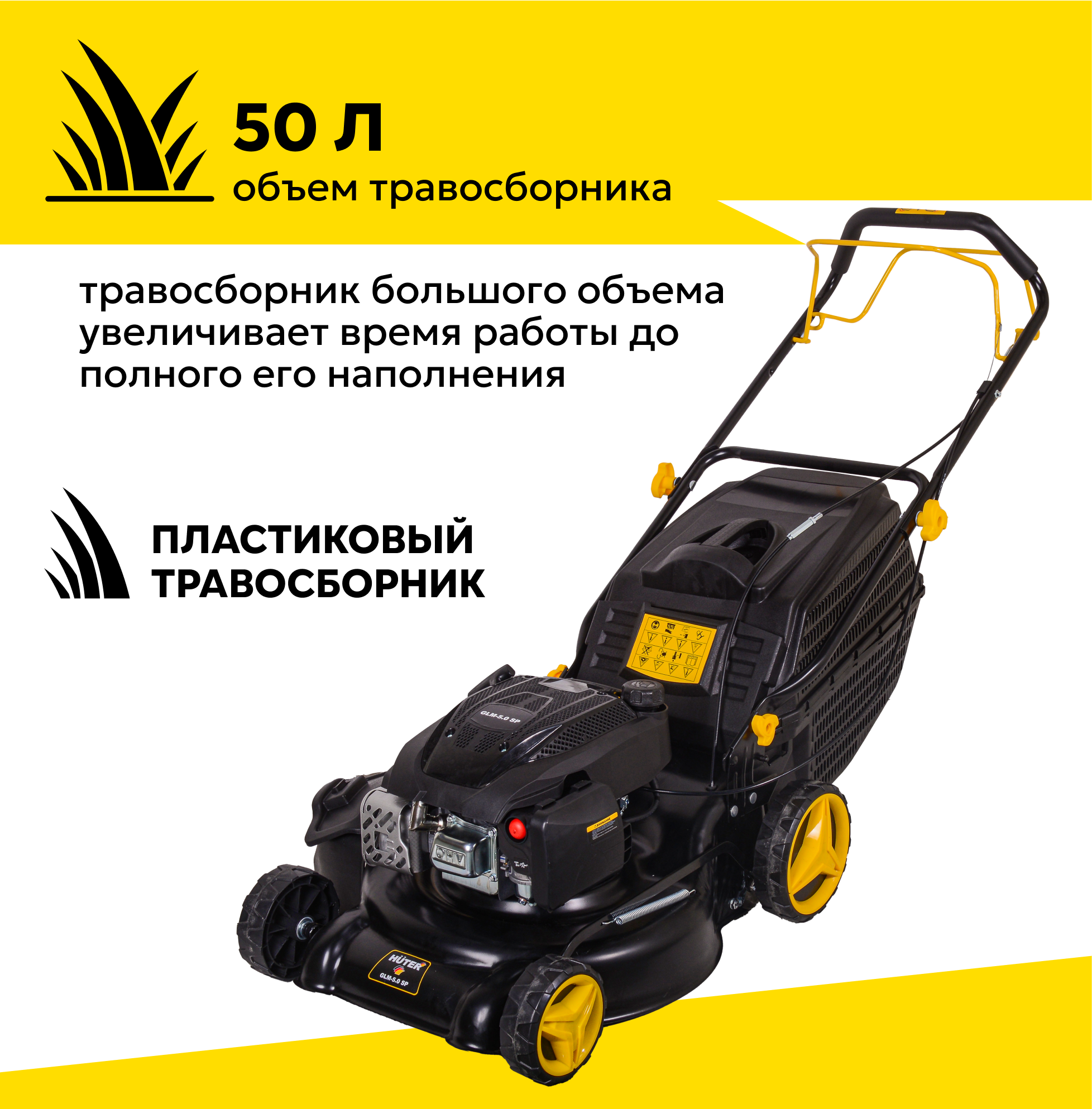 Газонокосилка бензиновая самоходная HUTER GLM-5.0SP, 5 л. с, ширина скоса 46см, пластиковый травосборник на 50л интересное: