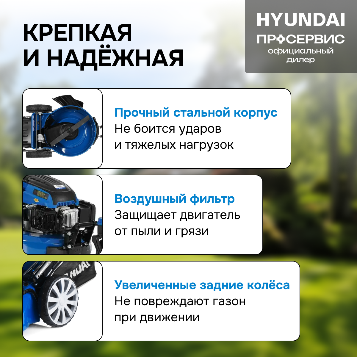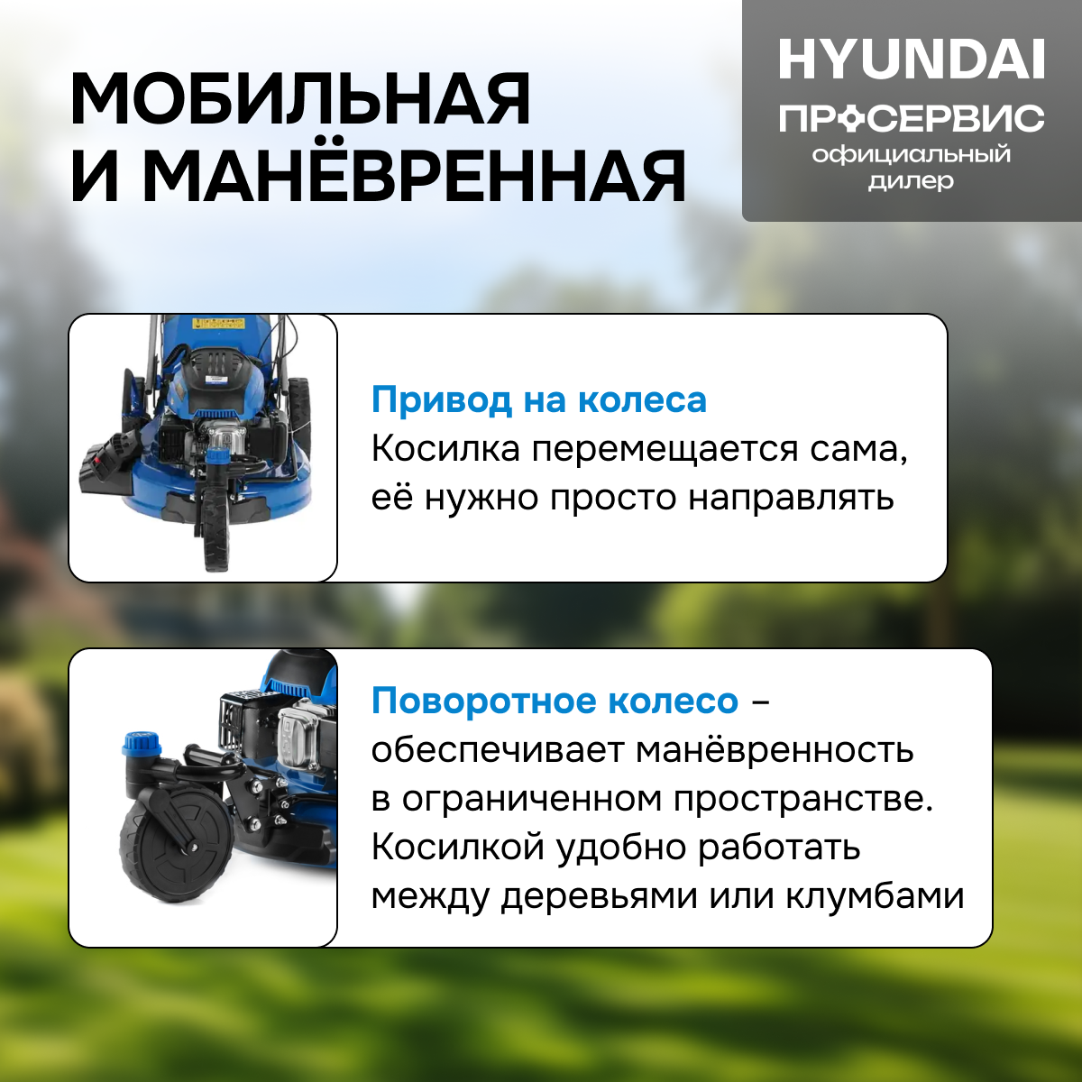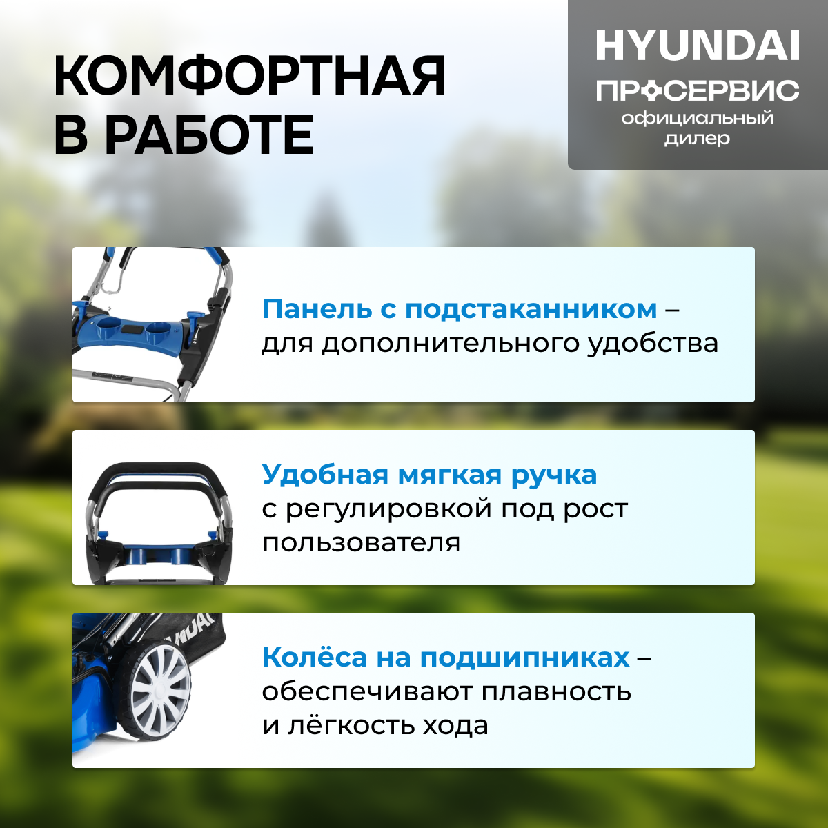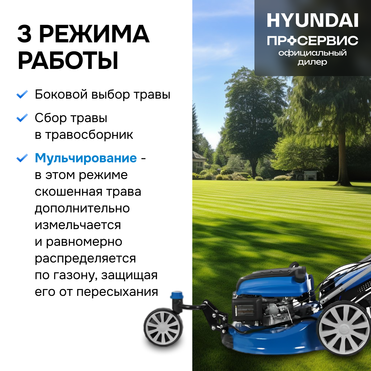 | Конструктивные особенности | плавающие колеса / регулировка ручки по высоте / складная ручка / мульчирование |