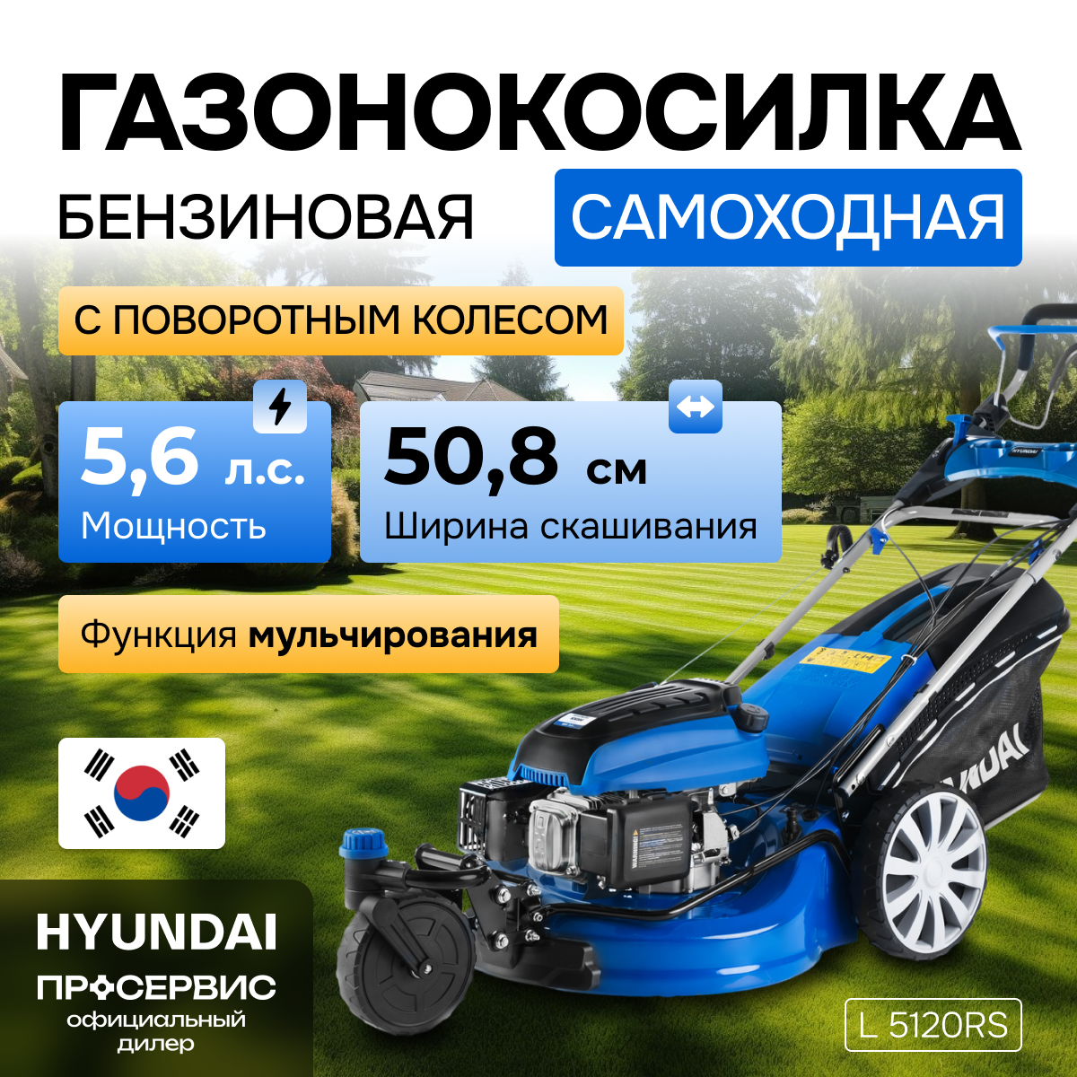 Газонокосилка бензиновая Hyundai L 5120RS, 50.8см, самоходная