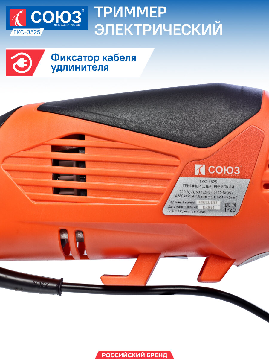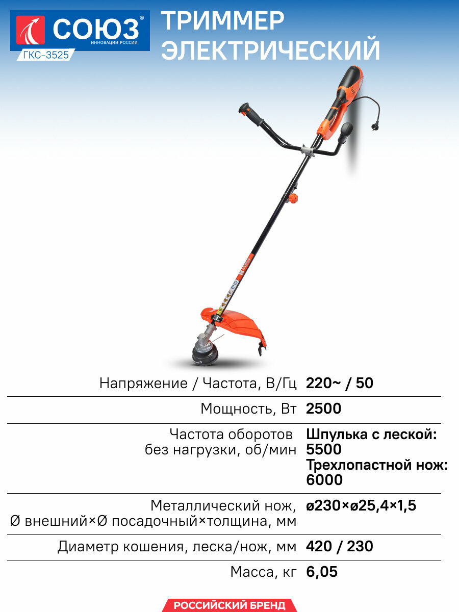 Триммер электрический Союз ГКС-3525 2500Вт, ширина скашивания 38см, плечевой ремень интересное: