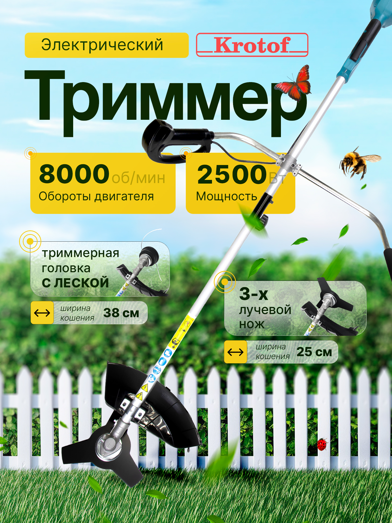 Триммер электрический ЭТ2500РВ Krotof (2000 Вт, разъемная штанга, вело-руль, леска + нож 3 зуба) интересное: