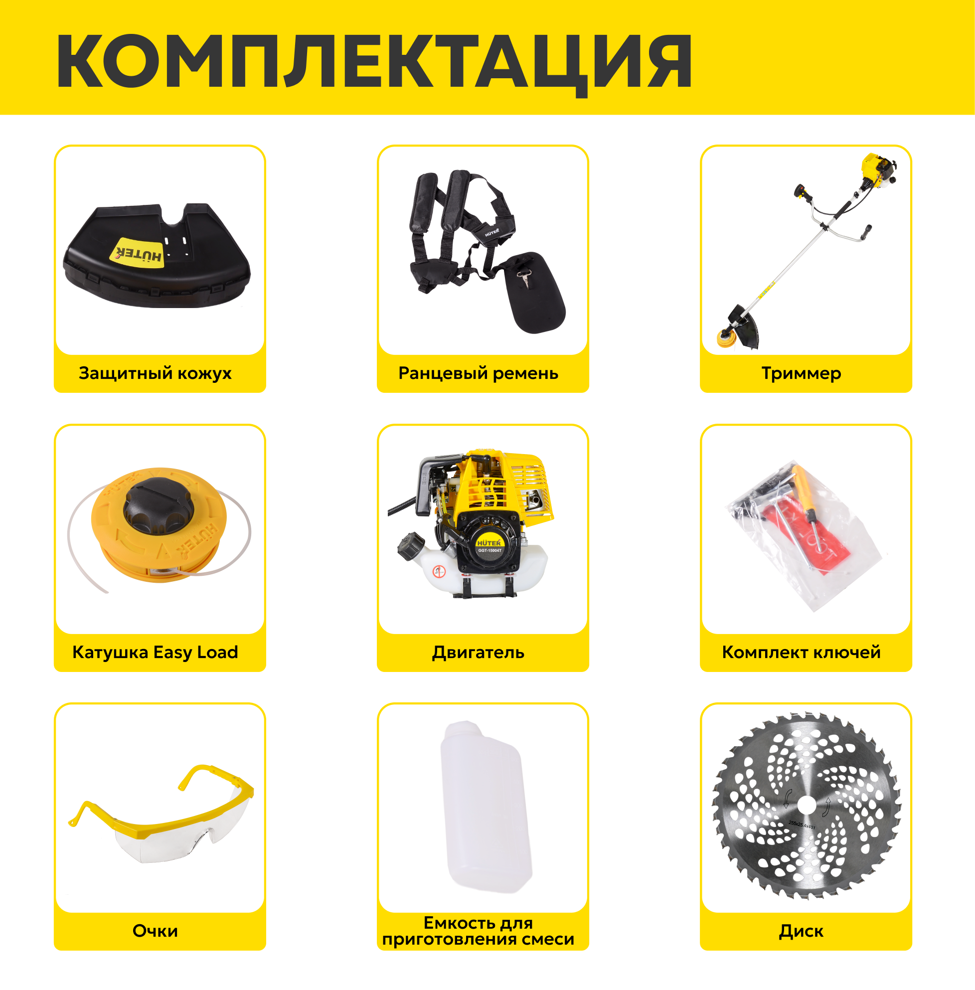 Двигатель в сборе — 1 шт. Штанга в сборе с редуктором — 1 шт. Защитный кожух — 1 шт. Режущий диск — 1 шт. Катушка с леской — 1 шт. Рукоятки управления (левая и правая) — 1 шт. Ранцевый ремень/ Наплечный ремень — 1 шт. Комплект ключей – 1 шт. Паспорт продукции — 1 шт. Защитные очки - 1 шт.