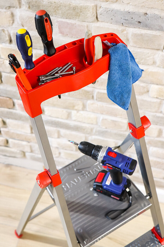 | Плюсы: | Удобный отсек сверху для всякой мелочевки,саморезов. Высота лестницы позволяет с комфортом работать. Становился даже на самую верхнюю ступеньку - выдерживает. |