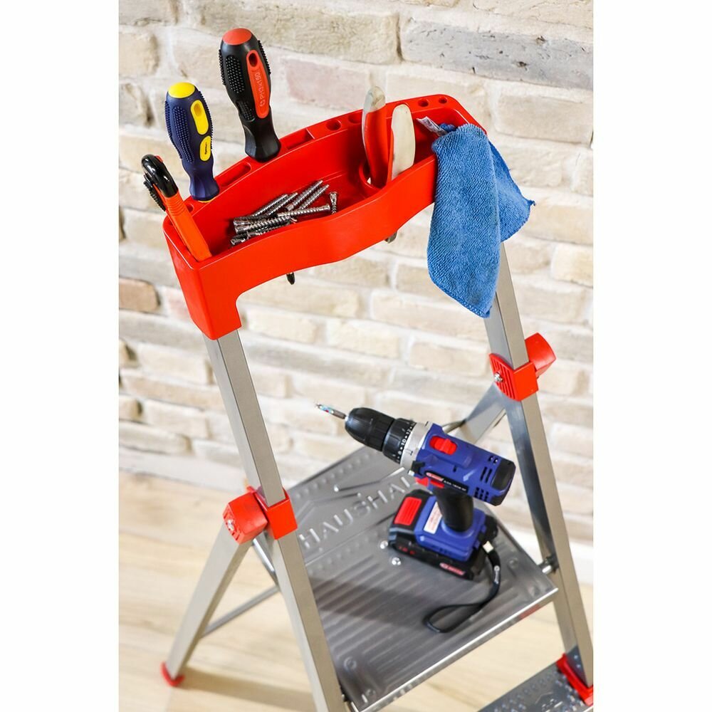 | Плюсы: | Удобный отсек сверху для всякой мелочевки,саморезов. Высота лестницы позволяет с комфортом работать. Становился даже на самую верхнюю ступеньку - выдерживает. |