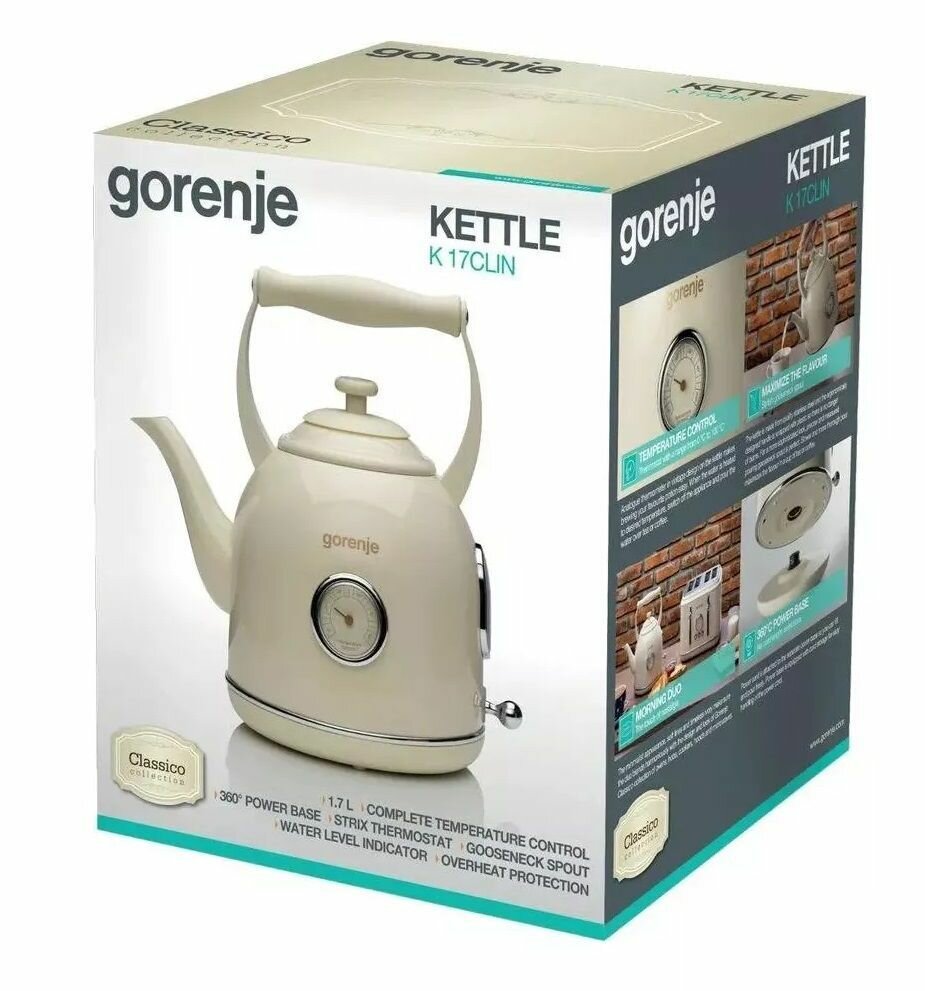 Чайник электрический Gorenje K17CLIN 2000 Вт 1.7 л, прорезиненное нескользящее основание, автоотключение, защита от включения без воды, шкала уровня воды, термометр, фильтр от накипи интересное: