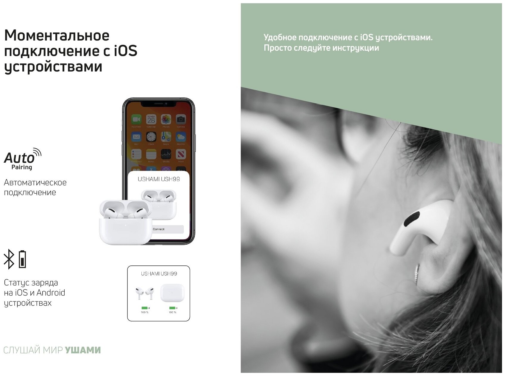 Беспроводные наушники с микрофоном USH99, TWS, BT 5.1, ANC, 300 мАч, белый, USHAMI US999 интересное: