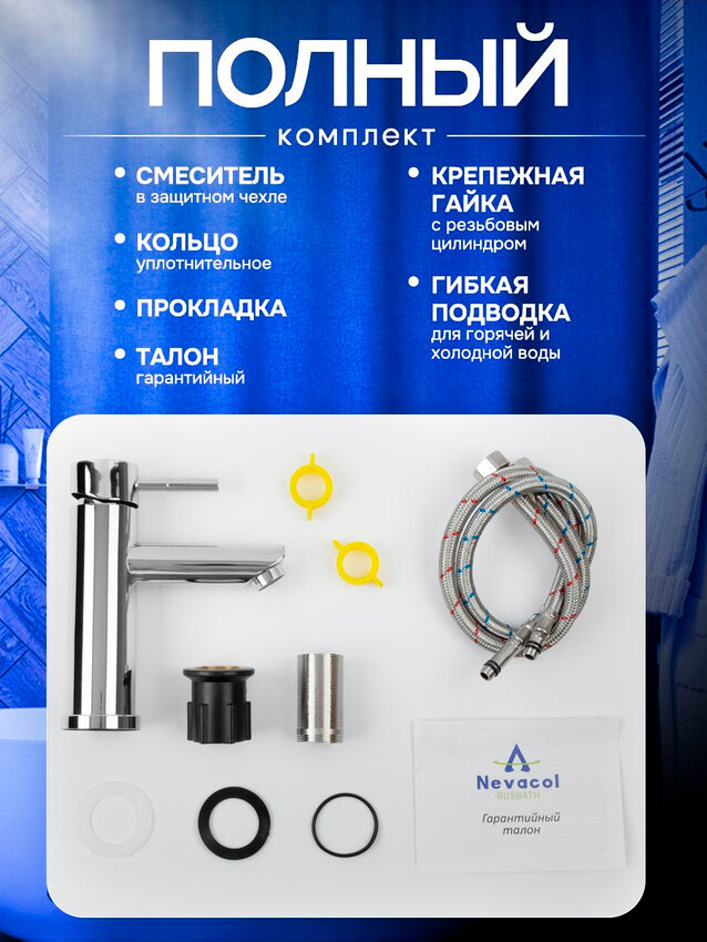 | Комплектация | Смеситель в защитном чехле, уплотнительное кольцо, прокладка, крепежная гайка с резьбовым цилиндром, гибкая подводка для горячей и холодной воды. Каждый элемент находится в защитном чехле, все элементы уложены в плотную заводскую коробку. |