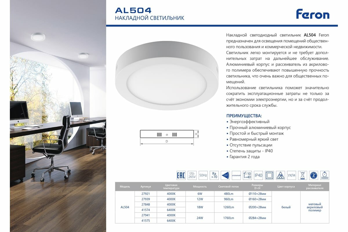 Светильник FERON светодиод, 24W, 1760Lm, белый 4000К, AL504 27941
