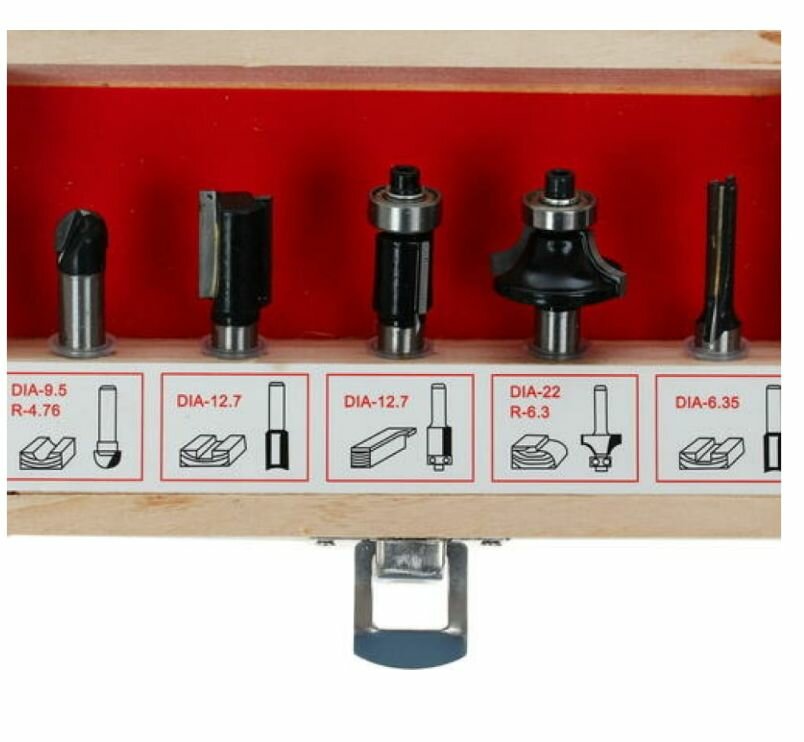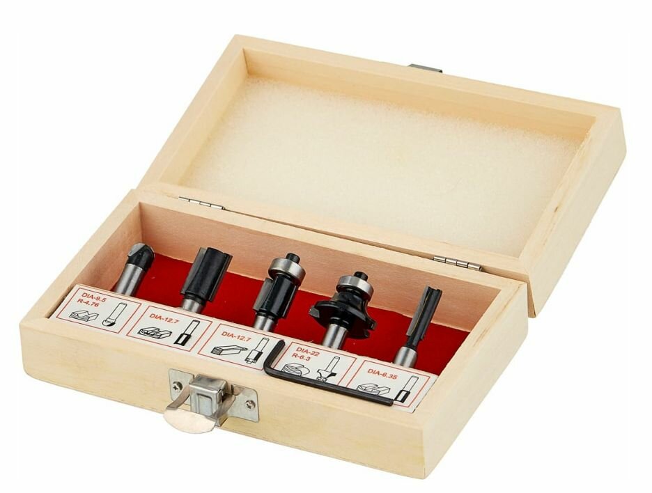 | Комплектация | галтельная фреза, пазовая фреза (2 шт), фреза для выборки заподлицо, фреза профильная с направляющей |
