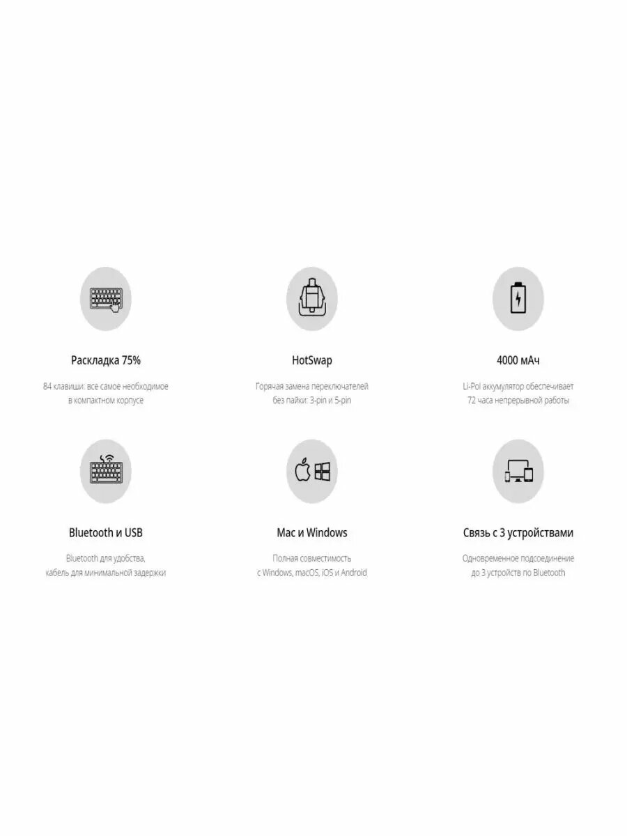 | Комплектация | Клавиатура; Коробка; Кейкап пуллер — позволит легко снять кейкапы с клавиатуры; Металлический свитч пуллер — для легкой замены свитчей; Кабель USB-A - USB Type-C; 5 сменных клавиш; Инструкция. |