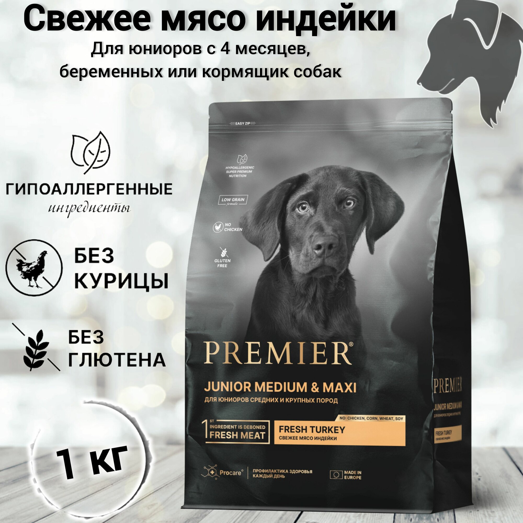 Сухой корм Premier для юниоров средних и крупных пород с 4 месяцев, беременных и кормящих собак, с индейкой, 1 кг