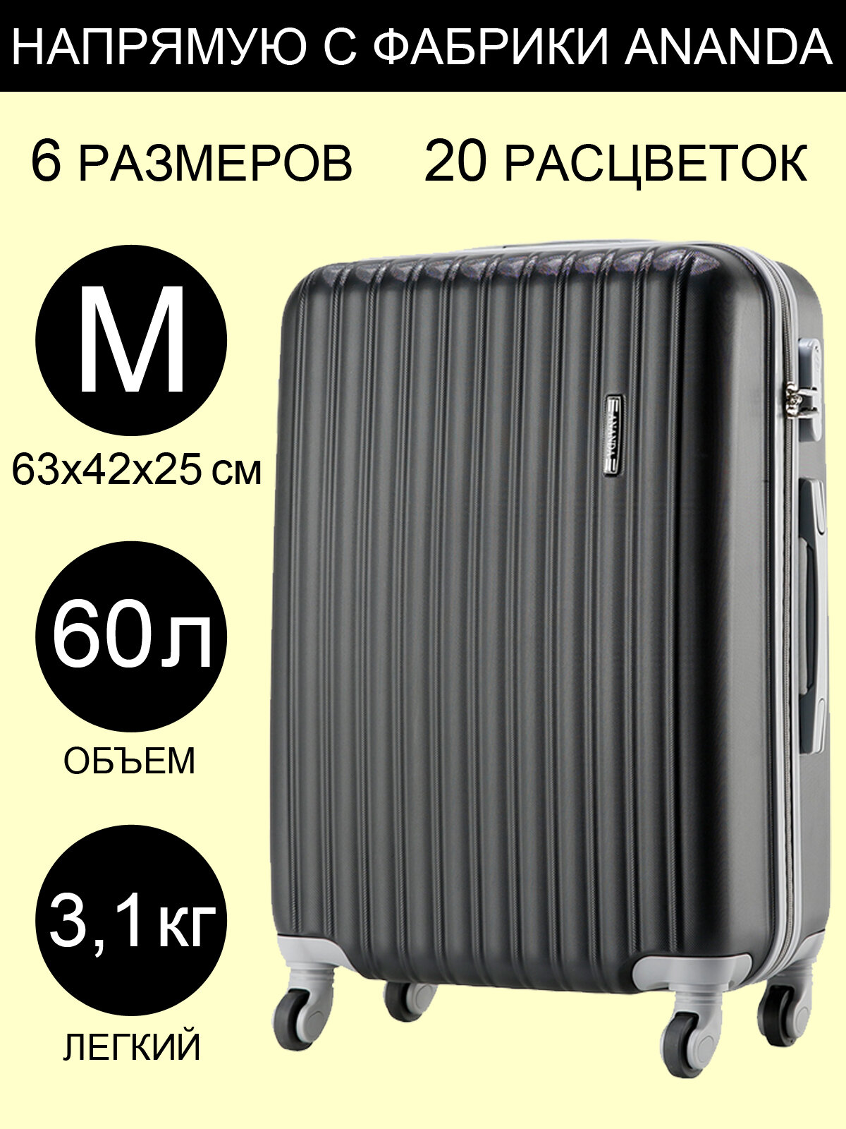 Чемодан ANANDA, средний М+, 67 см, 70 л, черный