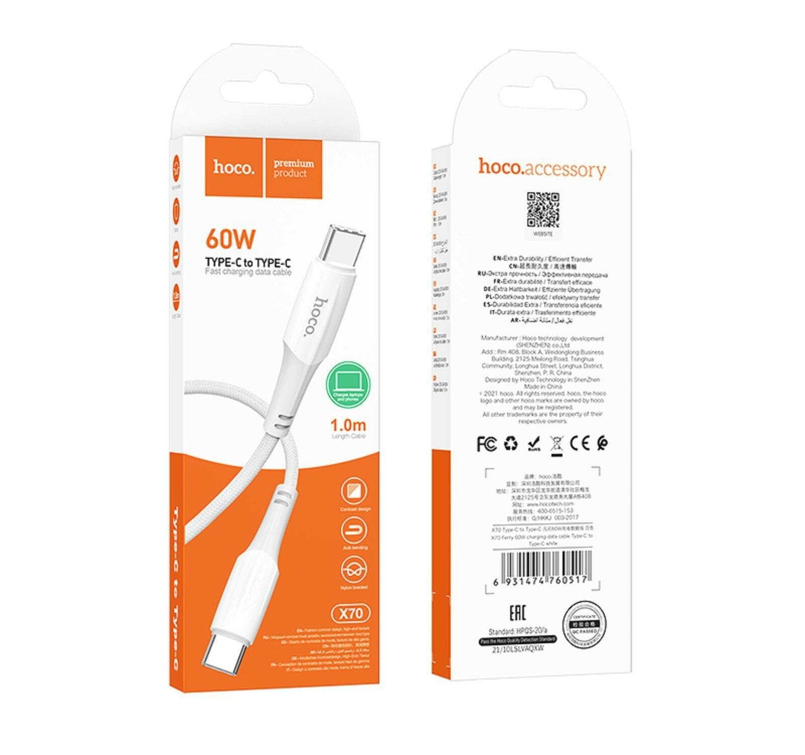 Кабель Type-C на Type-C, HOCO, X70, 1м, 60W, белый