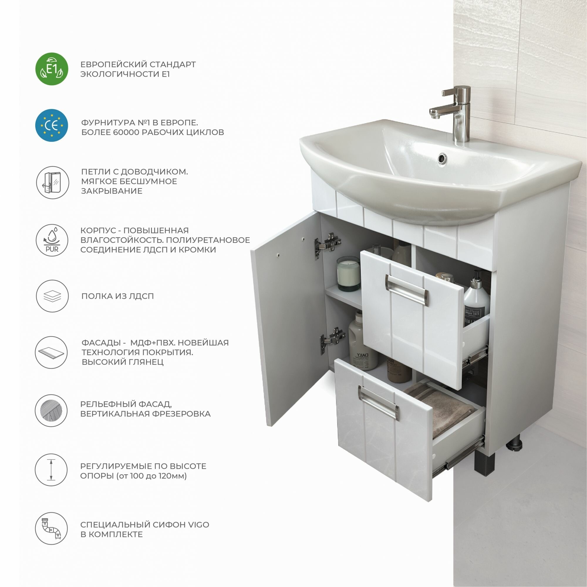 | Комплектация | Тумба в собранном виде, ножки, раковина |