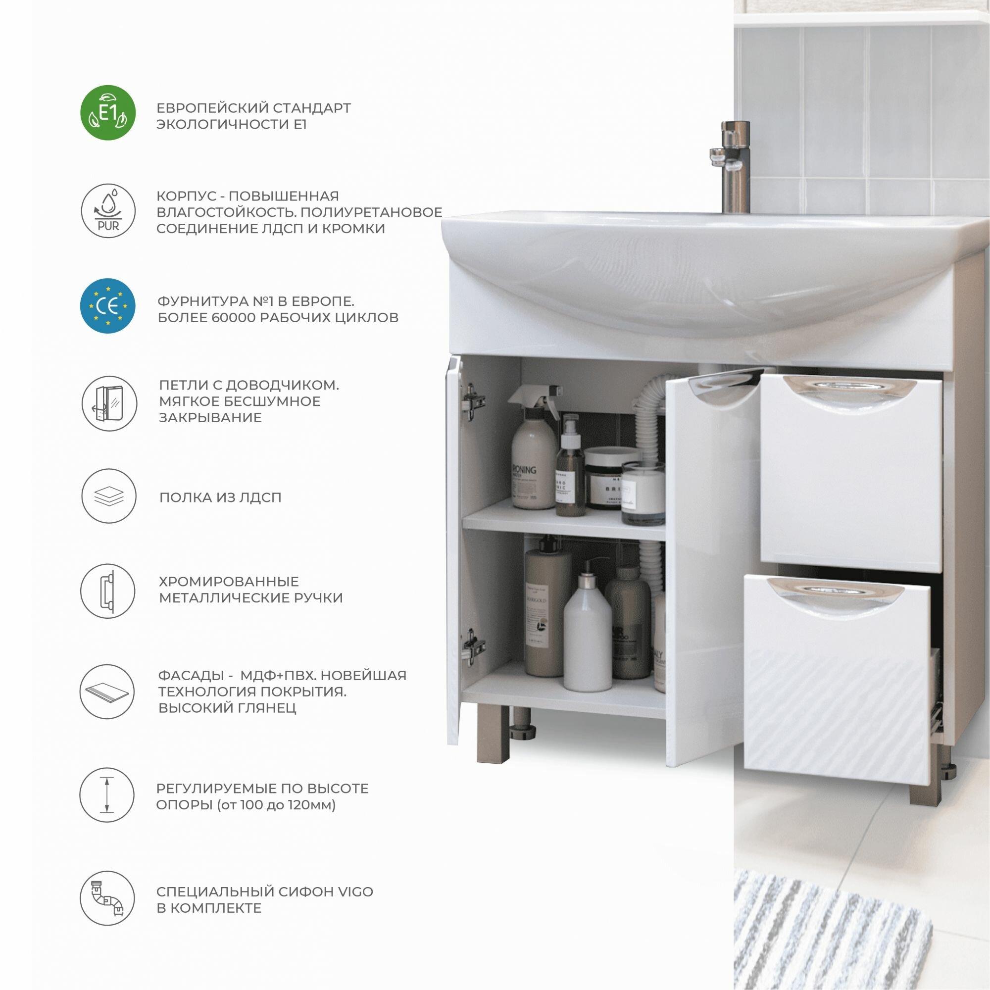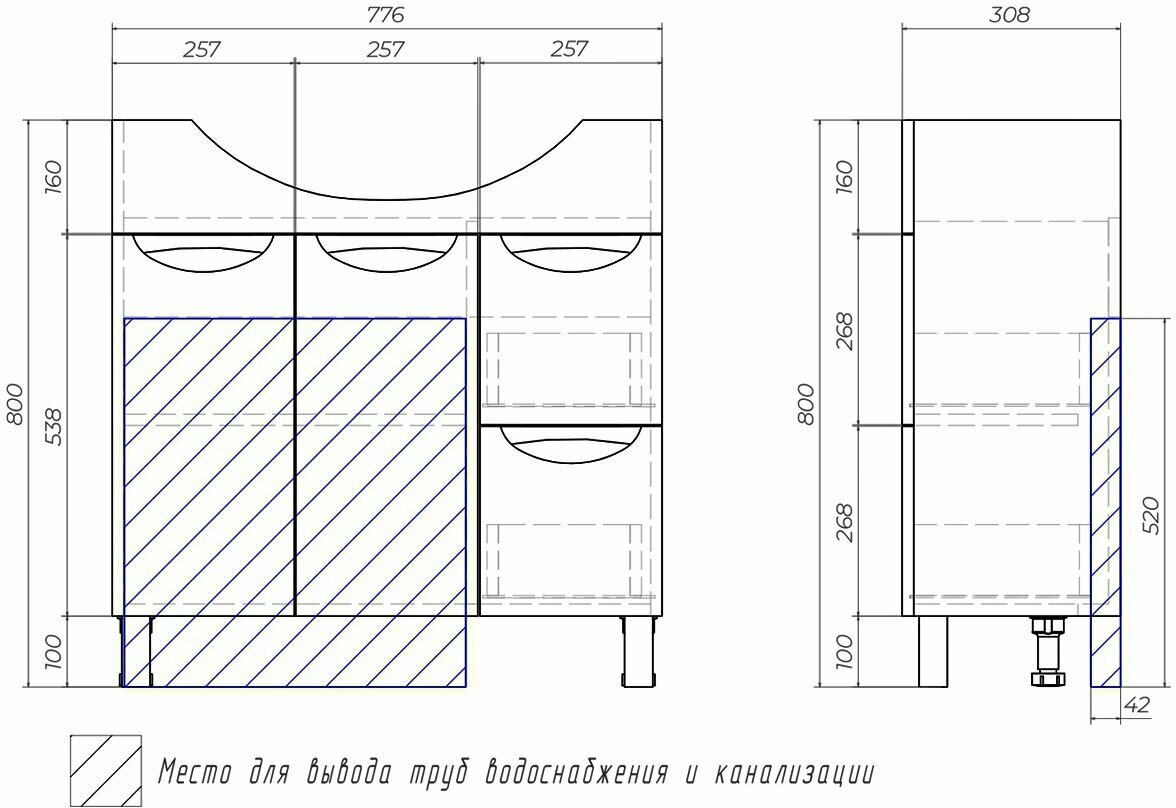| Комплектация | Тумба в собранном виде, ножки, раковина |