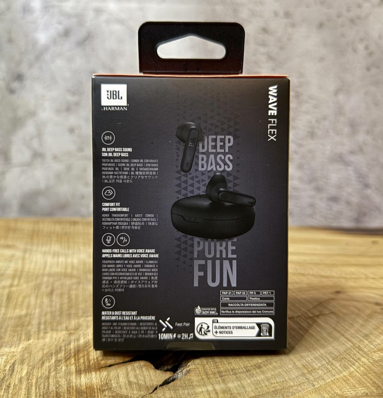 Блютуз наушники беспроводные JBL Wave Flex, Весит всего 3,8 грамма, конструкция наполовину в ухе, удобна в носке, время автономной работы составляет 32 часа, шумоподавление во время звонков