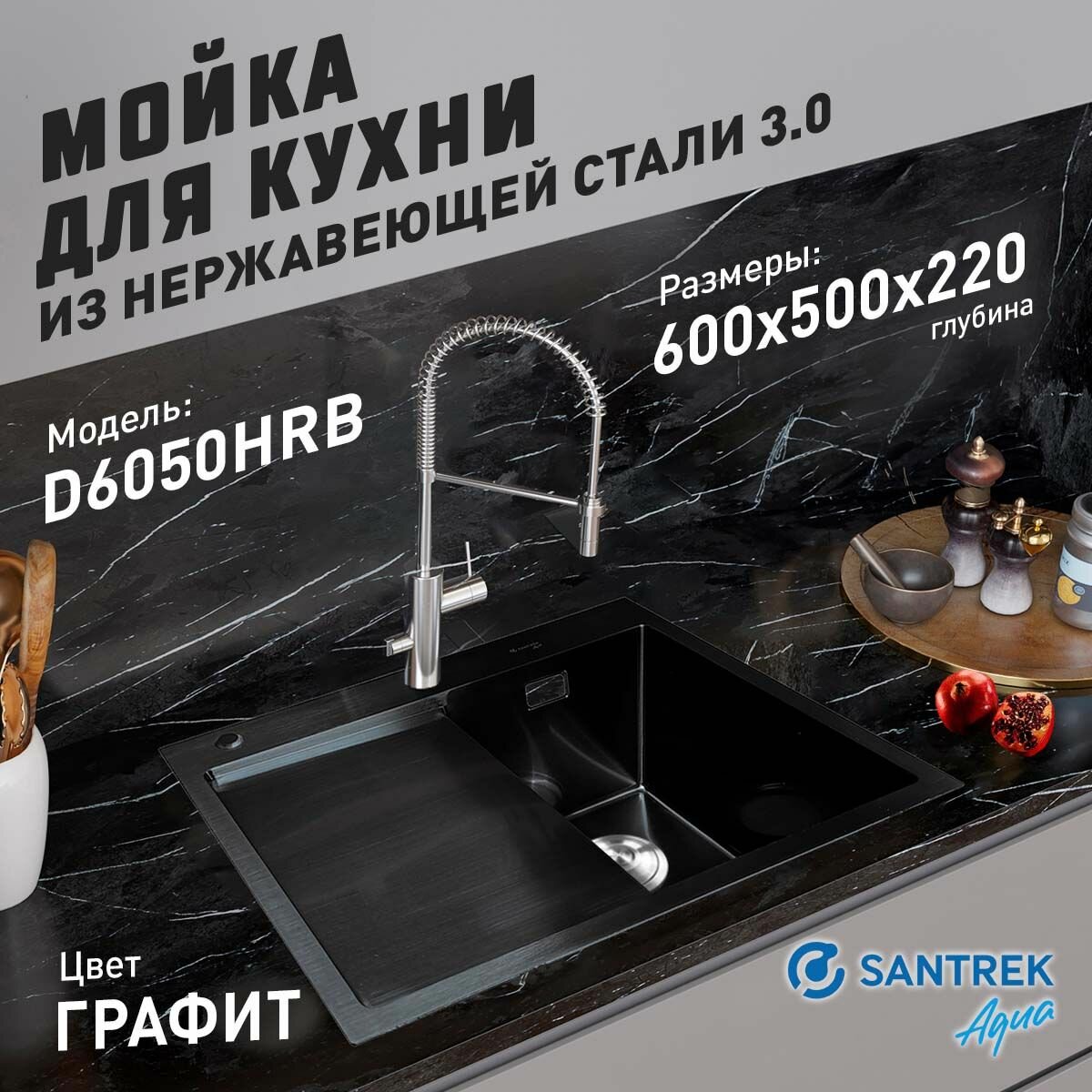 Мойка нержавеющая врезная SANTREK AQUA 600х500х220 т 3,0 графит D6050HRB правая (+ сифон + дозатор + коландер 440х220)