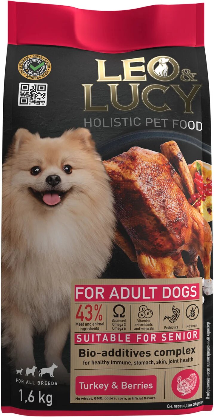 LEO&LUCY сухой холистик корм полнорационный для взрослых собак всех пород с индейкой, ягодами и биодобавками, подходит пожилым, 1,6 кг