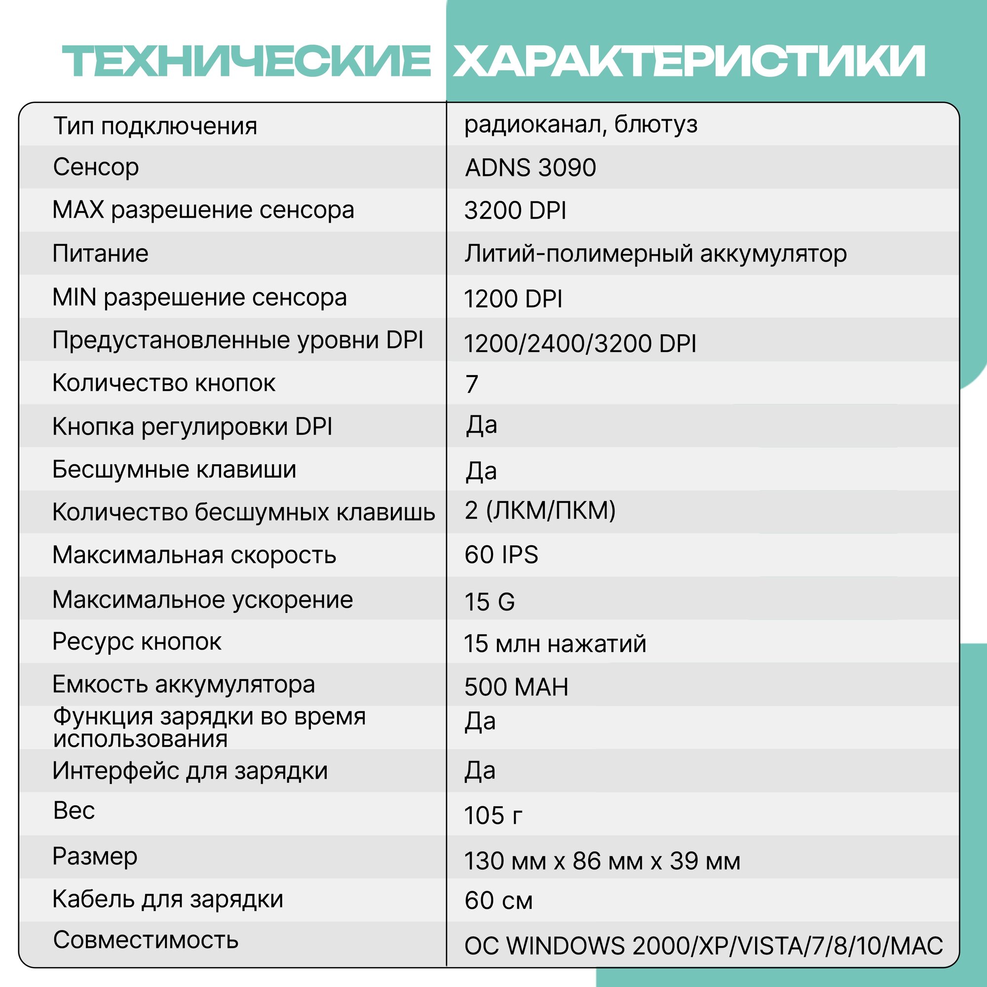 Отличная мышь. Соотношение цена/качество идеальное. Зарядка 2 часа. Отклик быстрый, можно подобрать режим
