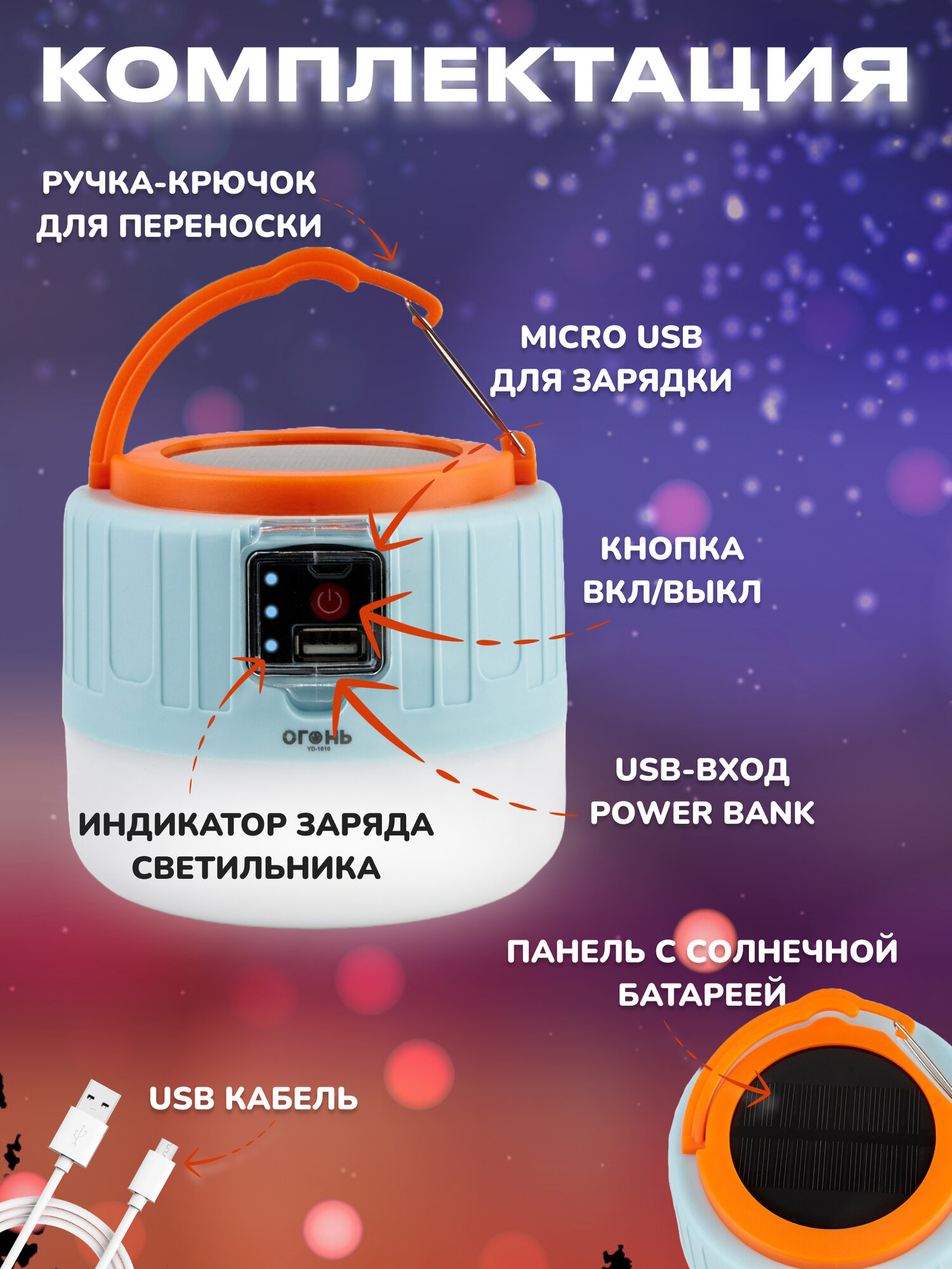 Водонепроницаемость, Механическая регулировка яркости, Защита от короткого замыкания, Защита от повышенного напряжения; время зарядки аккумулятора: 5 ч; подробная комплектация: фонарь кемпинговый, зарядный кабель; количество режимов работы: 3; потребление питания: от USB