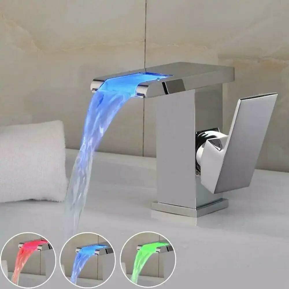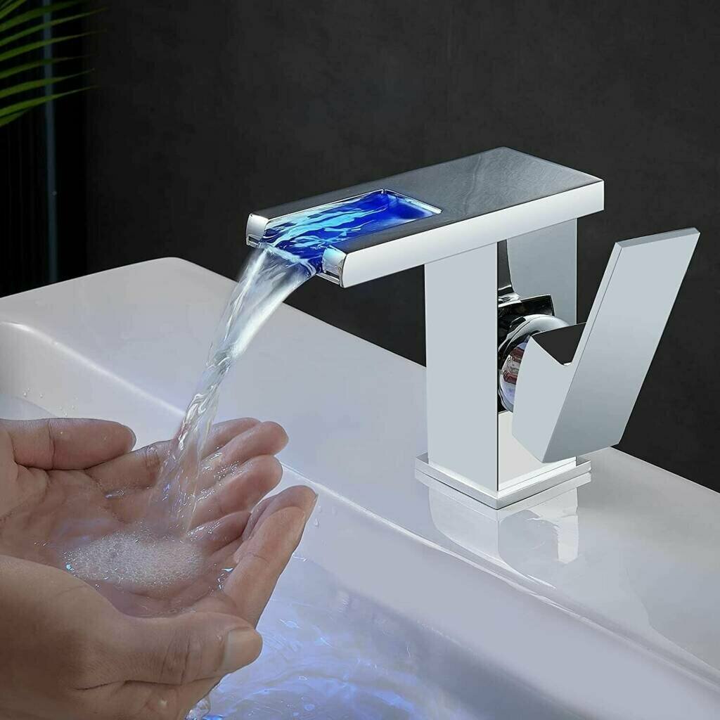 Смеситель для раковины с каскадным изливом и подсветкой Bono Silver хром, кран для ванной из нержавеющей стали
