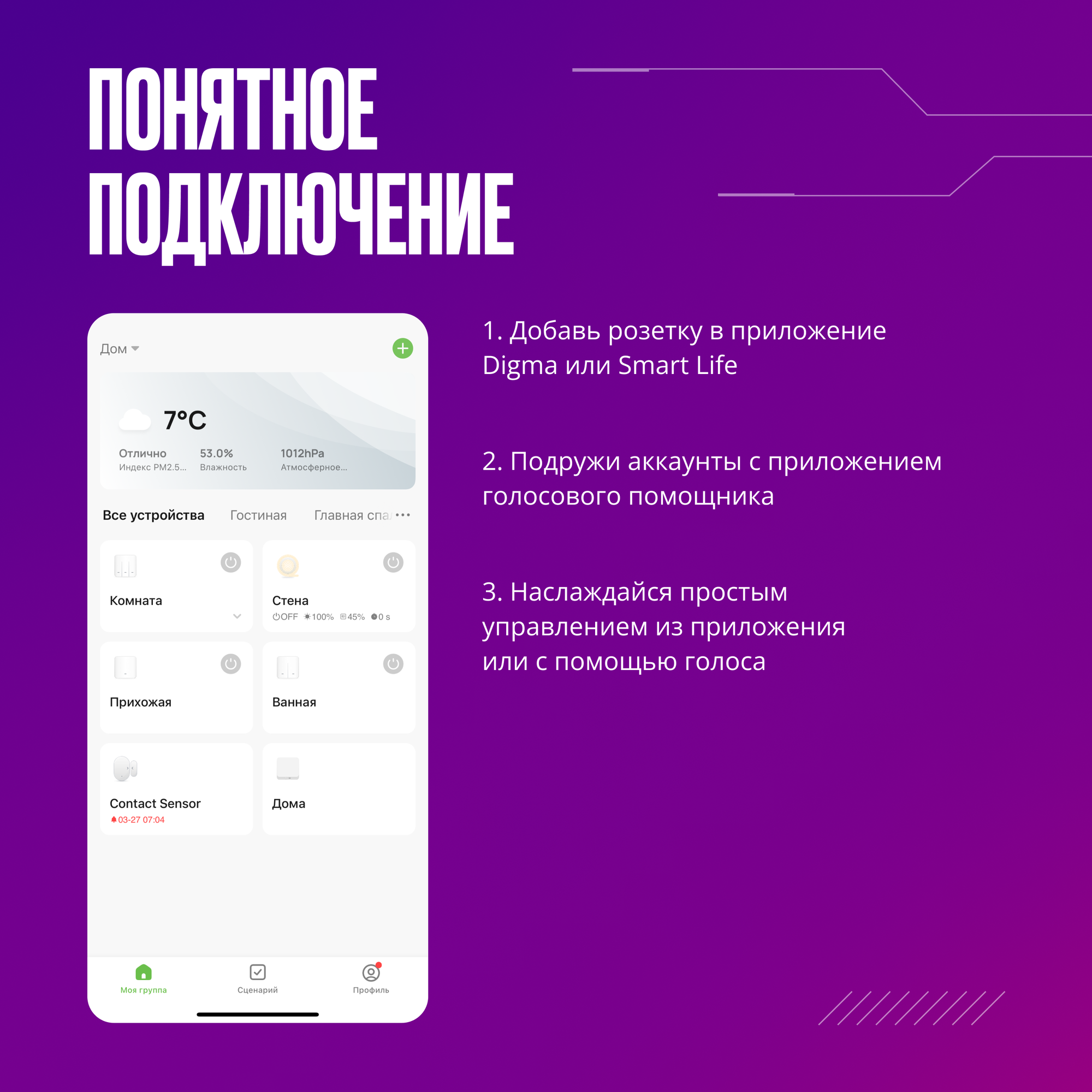 | Плюсы: | все работает на ура. каждая розетка индивидуальна. не греется. настройка через приложение Digma. завязалось с Алисой без проблем. |