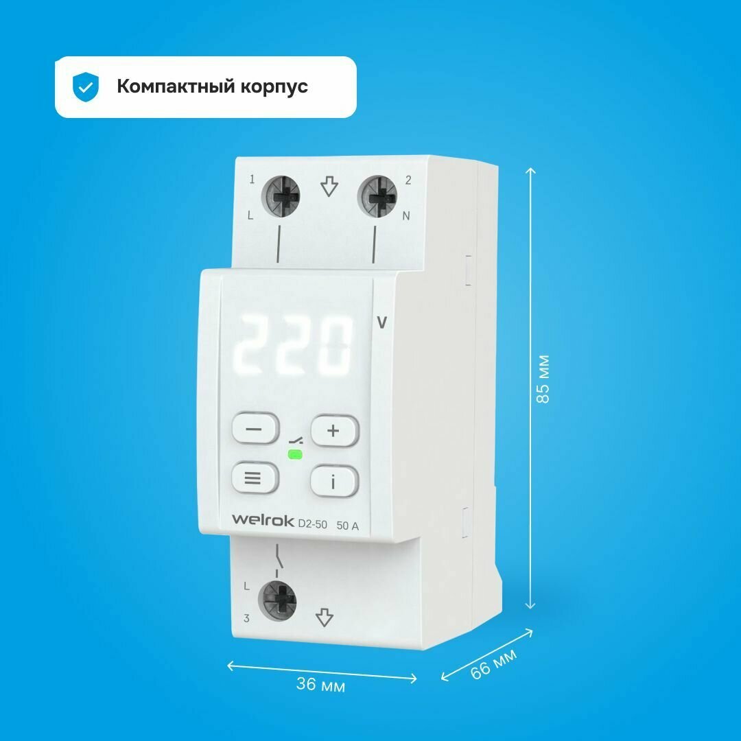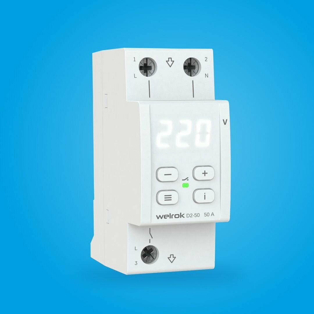 Купить Реле контроля напряжения Welrok D2-50, одна фаза, 50А, два модуля, термозащита, белая индикация