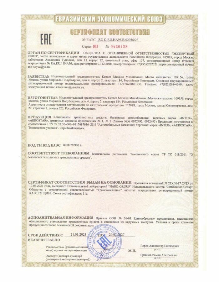 Багажник Inter Aerostar R-43 на рейлинги, на рейлинги, аэродинамический